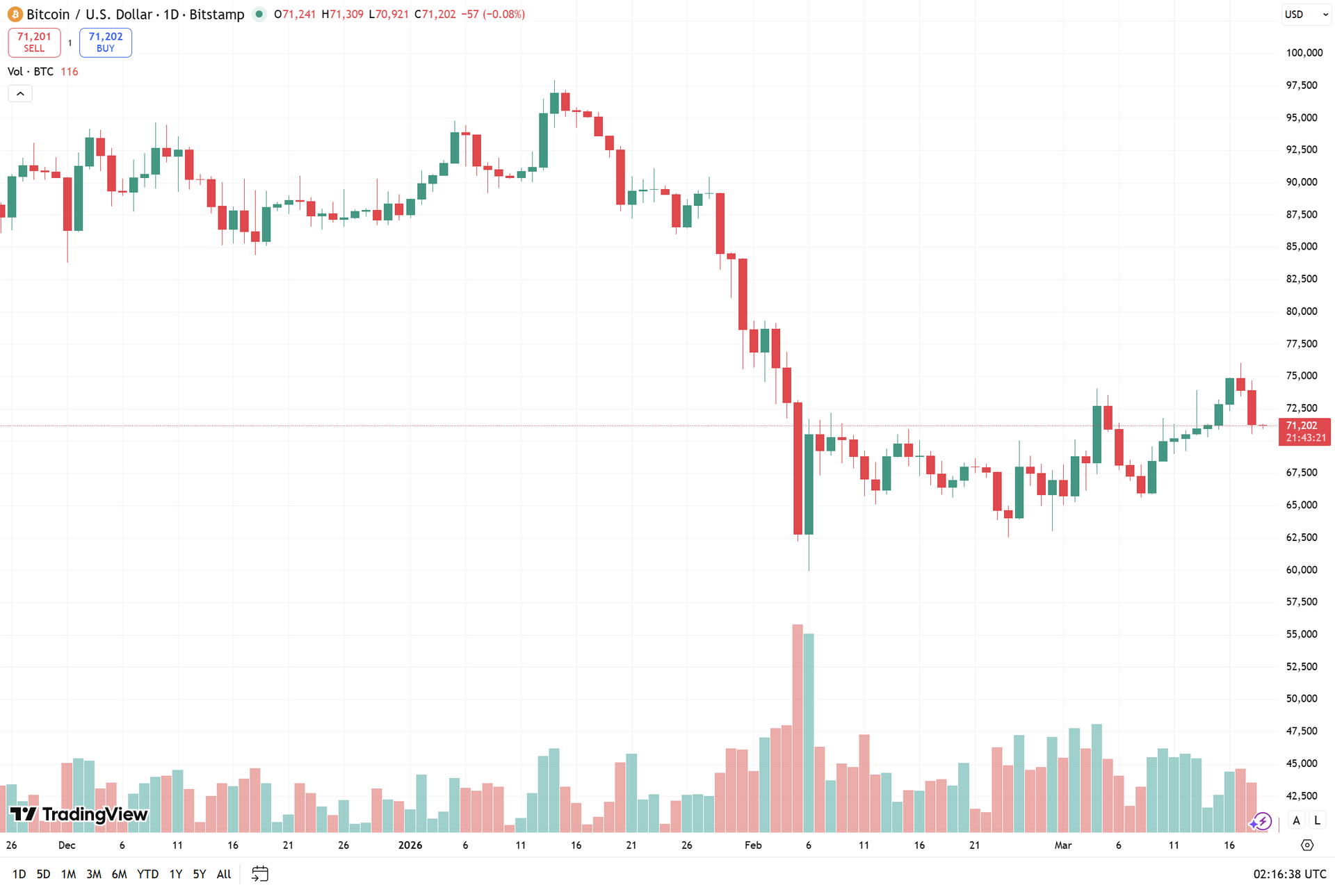 Biểu đồ giá theo ngày của BTC tính đến 19.3 - Ảnh: TradingView/Bitstamp
