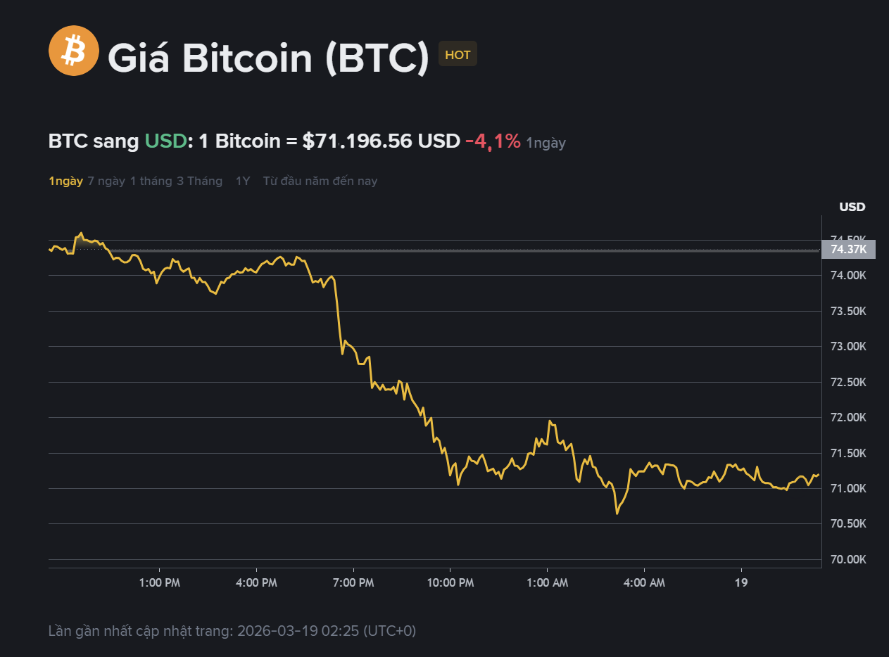 Bitcoin vừa giảm xuống dưới 71.000 USD sau khi chạm gần 76.000 USD, tương đương mức điều chỉnh khoảng 7%. Nguyên nhân chủ yếu đến từ áp lực chung của thị trường khi chứng khoán Mỹ giảm điểm, giá dầu tăng mạnh do xung đột tại Trung Đông và dữ liệu lạm phát của Mỹ cao hơn dự báo.