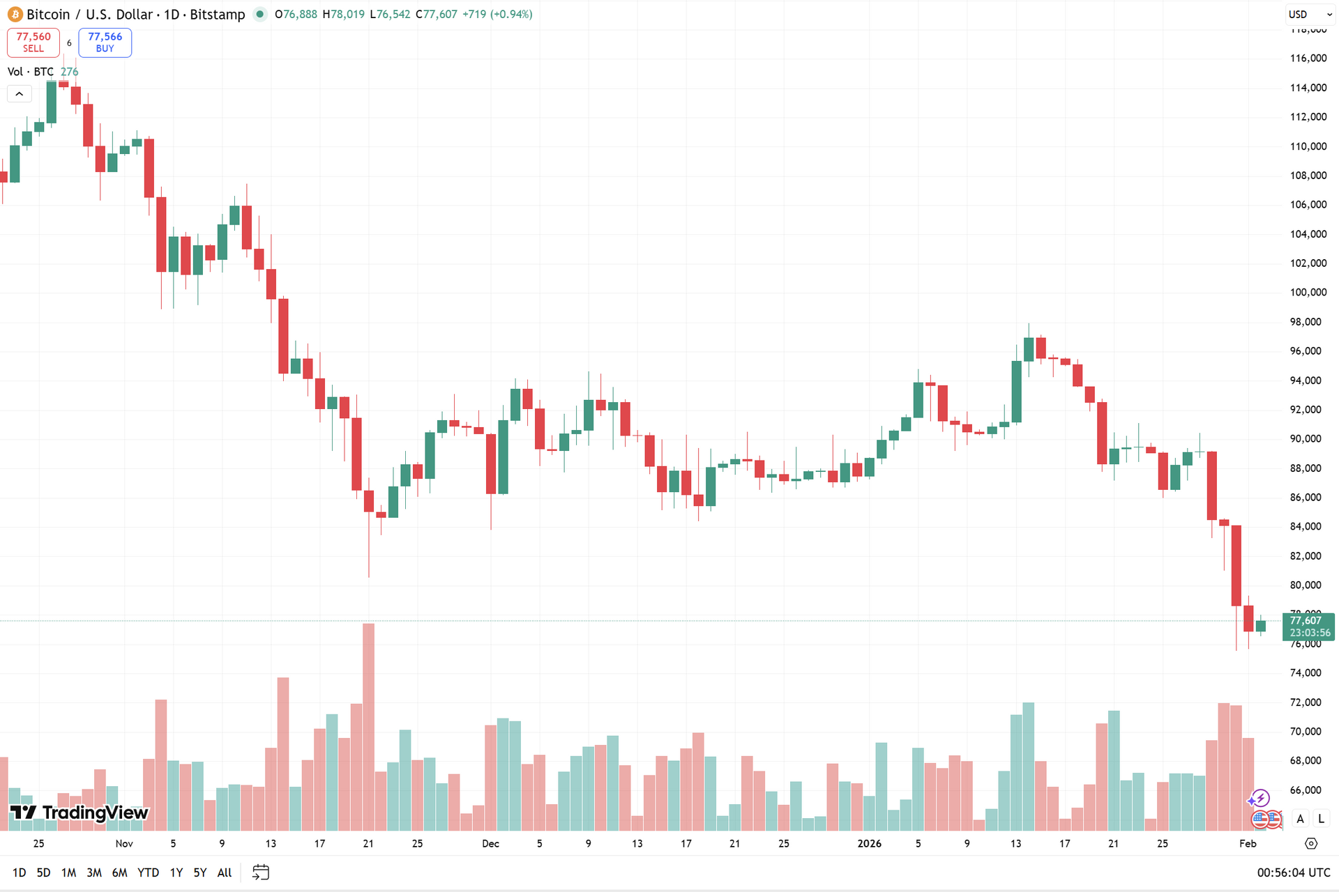 Biểu đồ giá theo ngày của BTC tính đến 2.2 - Ảnh: TradingView/Bitstamp