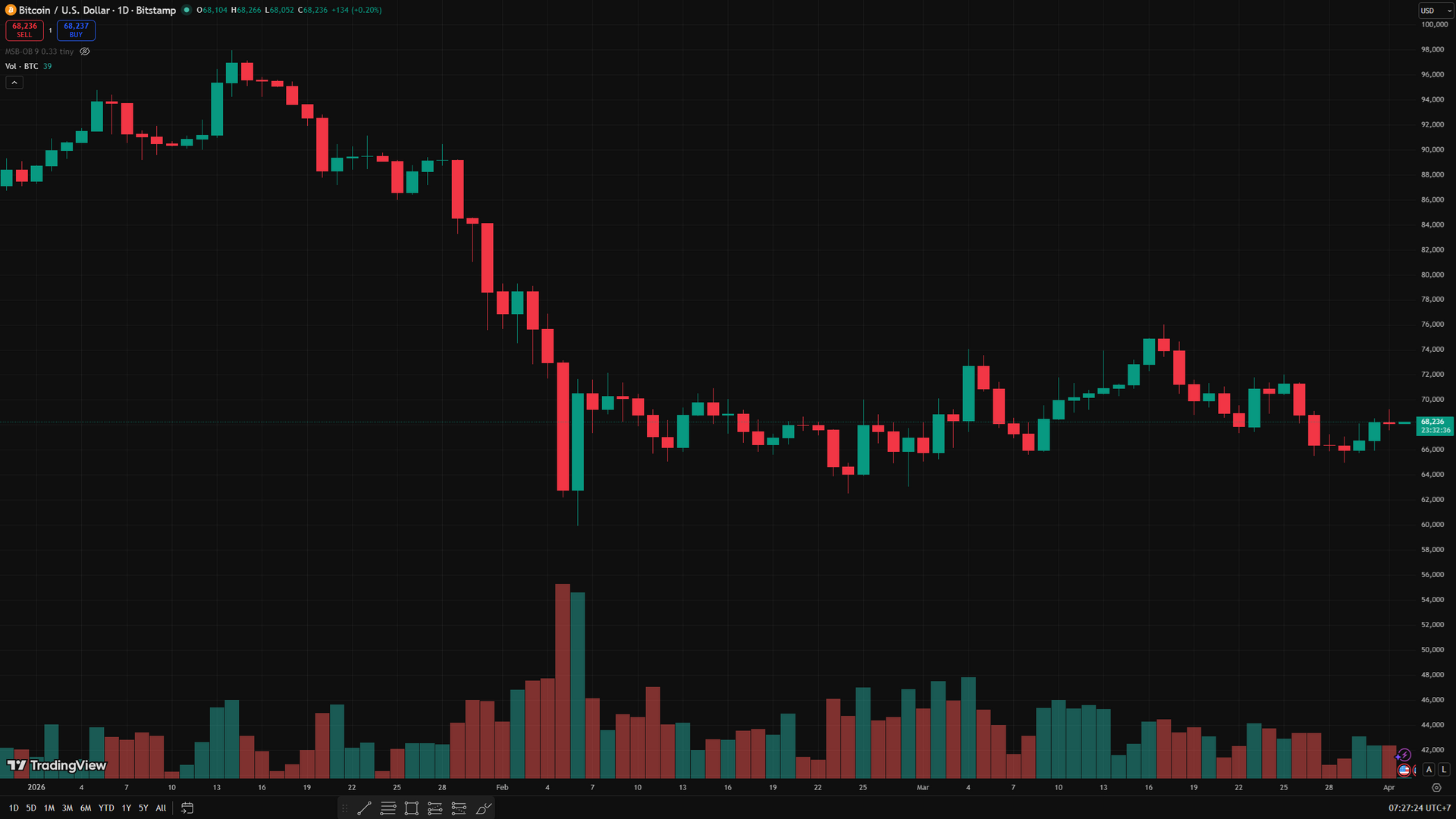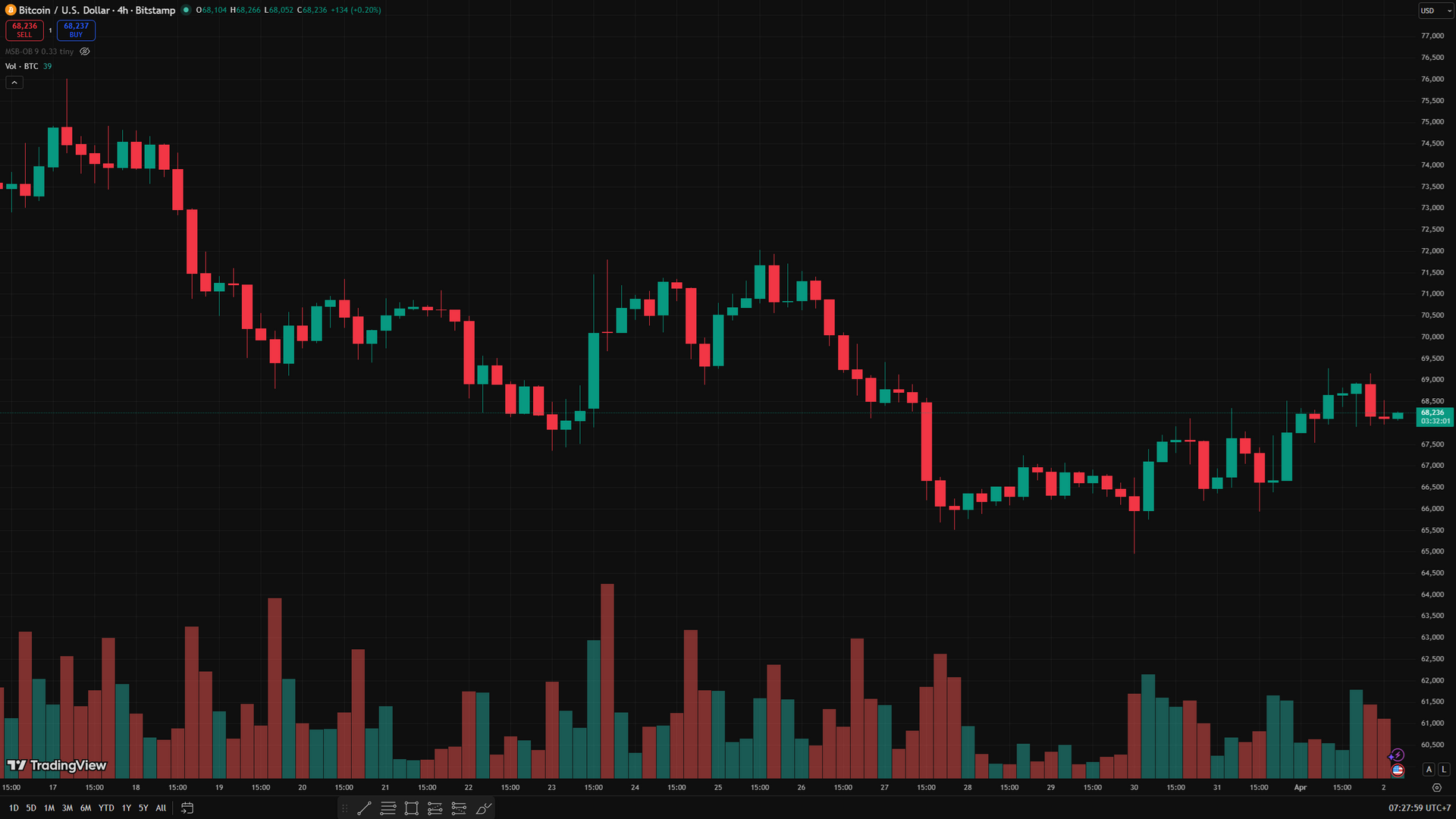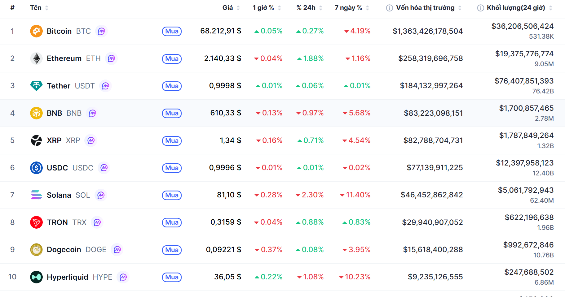 Giá Bitcoin hiện đang giao dịch quanh mức 68.207 USD, với vốn hóa thị trường vào khoảng 1.364 tỉ USD và khối lượng giao dịch trong 24 giờ đạt gần 40 tỉ USD.