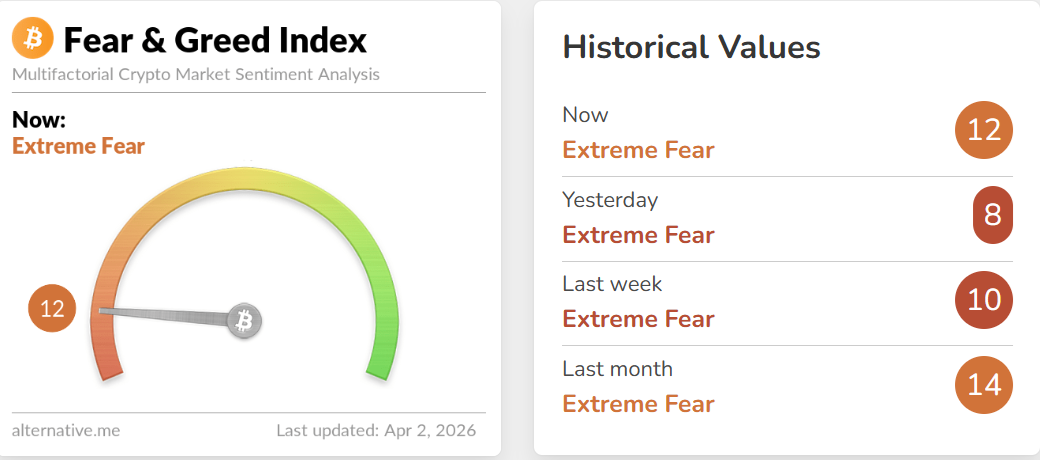 Chỉ số Sợ hãi & Tham lam (Crypto Fear & Greed Index) ngày 2.4 ghi nhận ở mức 12 điểm, tiếp tục nằm trong vùng Extreme Fear - “sợ hãi tột độ”. Mặc dù có sự cải thiện so với mức 8 điểm của ngày trước đó, chỉ số vẫn phản ánh tâm lý bi quan chiếm ưu thế trên toàn thị trường. Việc duy trì ở vùng điểm thấp cho thấy nhà đầu tư vẫn dè dặt, hạn chế mở rộng vị thế trong bối cảnh xu hướng giá chưa rõ ràng.
