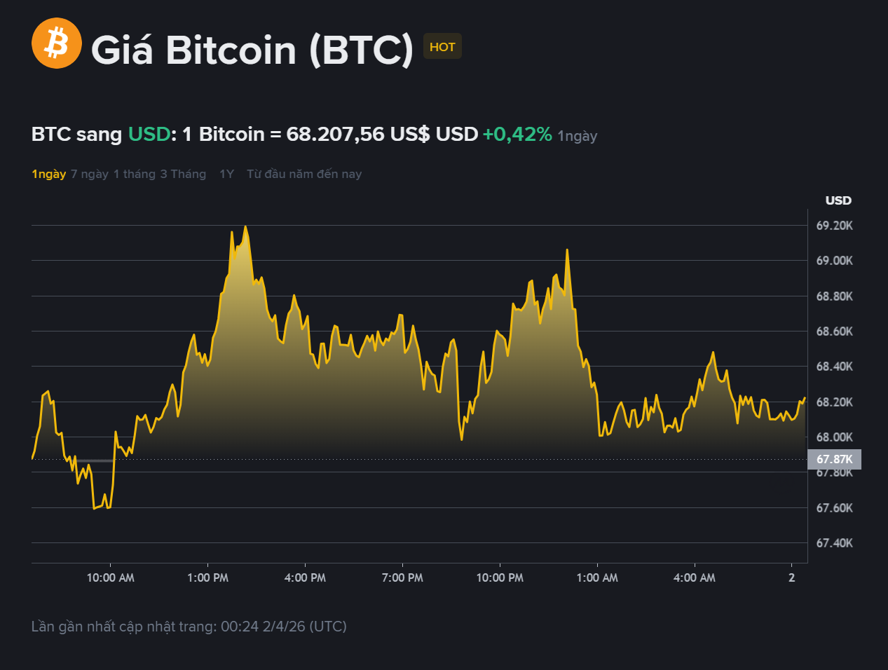 Tính đến sáng 2.4, Bitcoin được giao dịch quanh 68.207 USD, tăng 0,42% trong 24 giờ qua - Ảnh: Binance