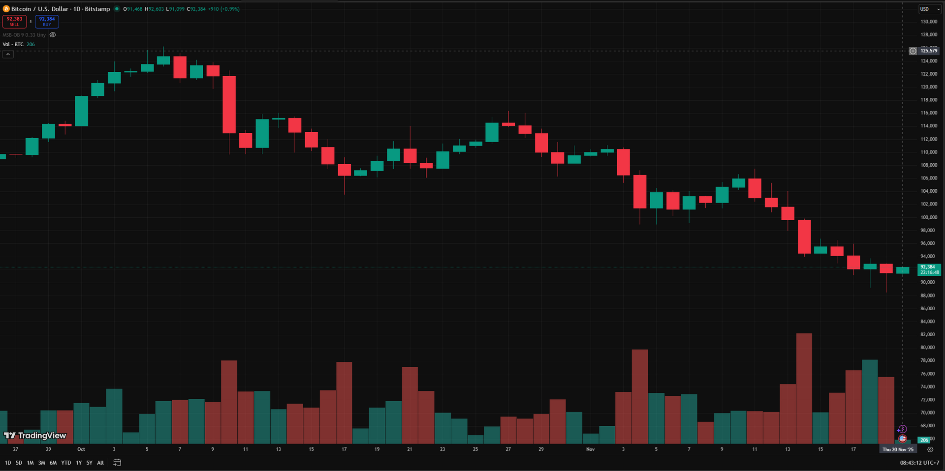 Biểu đồ giá theo ngày của BTC tính đến 20.11 - Ảnh: TradingView/Bitstamp
