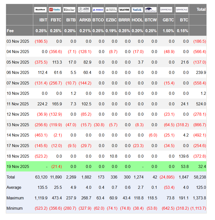 Dữ liệu dòng tiền Bitcoin ETF ngày 19.11 cho thấy tín hiệu khả quan khi tổng dòng vốn ròng (chưa tính BlackRock và VanEck) đạt 32,4 triệu USD, đánh dấu sự đảo chiều rõ rệt so với mức rút ròng 372,8 triệu USD trong ngày 18.11. Đây có thể xem là phiên đầu tiên sau chuỗi ngày xả liên tiếp mà thị trường ghi nhận dòng tiền dương trở lại.