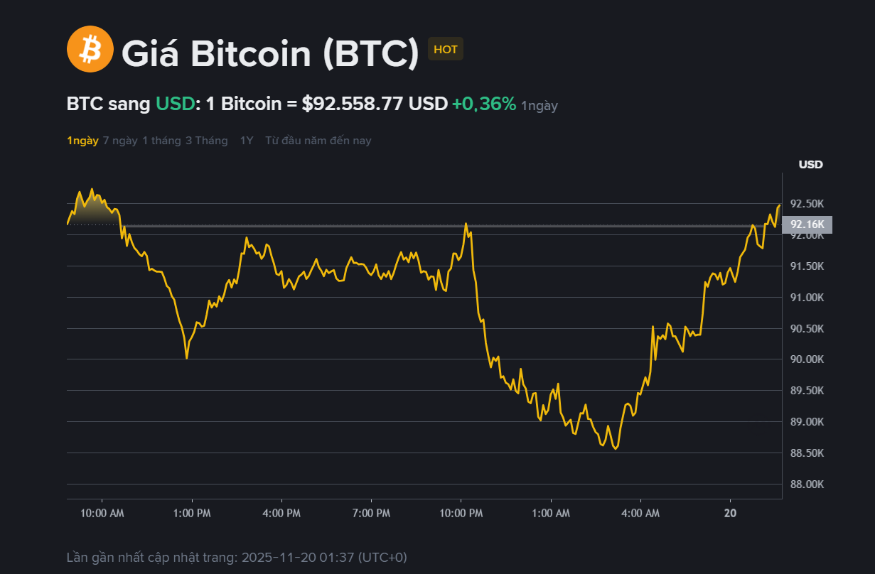 Giá Bitcoin hiện đang giao dịch quanh mức 92.558 USD, với vốn hóa thị trường đạt khoảng 1.840 tỉ USD và khối lượng giao dịch 24 giờ gần 80 tỉ USD. Trong phiên giao dịch ngày 19.11, đồng tiền số này tiếp tục biến động mạnh, dao động trong vùng 88.600 - 92.600 USD, phản ánh sự giằng co rõ rệt giữa bên mua và bên bán trong bối cảnh thị trường vẫn chịu áp lực điều chỉnh.