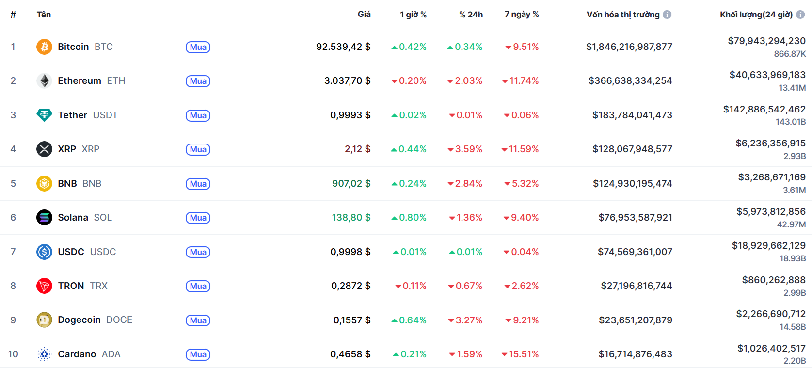 Biến động của Top 10 đồng coin lớn nhất thế giới