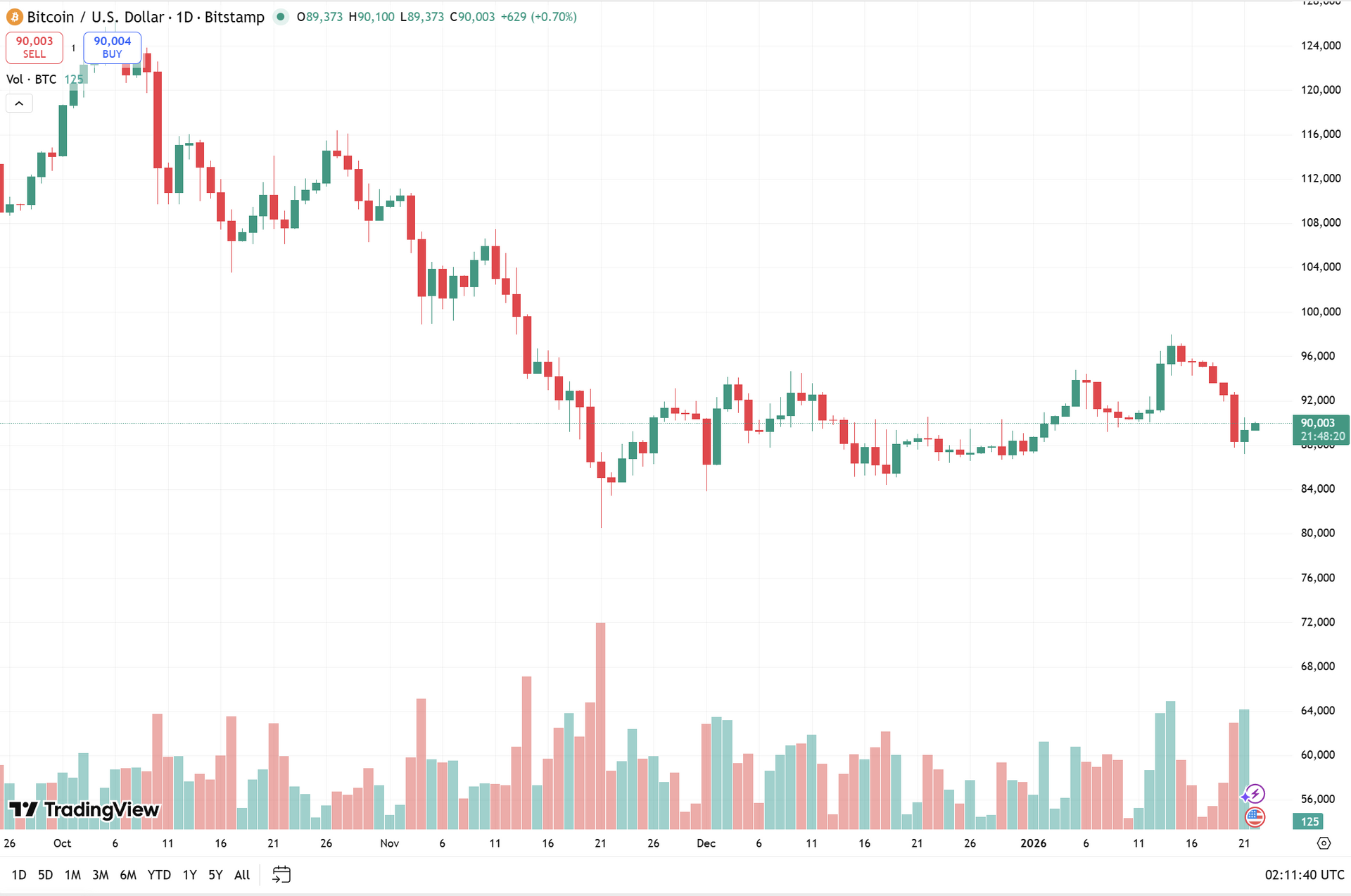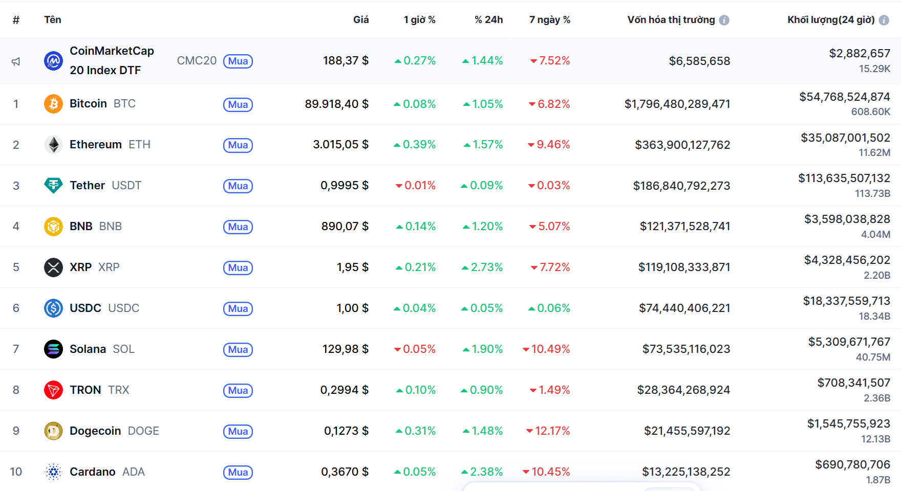 Giá Bitcoin hiện đang giao dịch quanh mức 90.028 USD, với vốn hóa thị trường vào khoảng 1.798 tỉ USD và khối lượng giao dịch trong 24 giờ đạt hơn 50 tỉ USD.