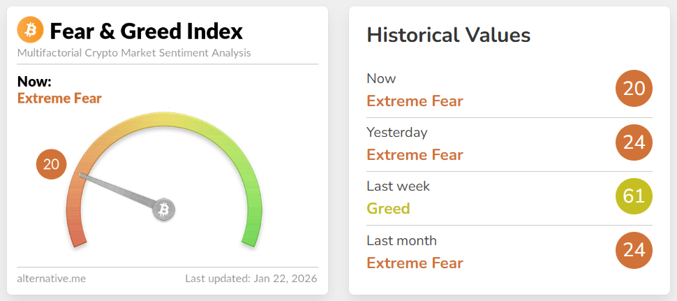 Ngày 22.1, chỉ số Sợ hãi & Tham lam (Fear & Greed Index) của thị trường tiền mã hóa giảm xuống 20 điểm, rơi sâu vào vùng sợ hãi tột độ (Extreme Fear). So với hôm qua (24 điểm) và đặc biệt là tuần trước (61 điểm - Greed/tham lam), tâm lý nhà đầu tư đã xấu đi nhanh chóng, phản ánh sự lo ngại gia tăng trước đà suy yếu của giá và biến động mạnh của thị trường.