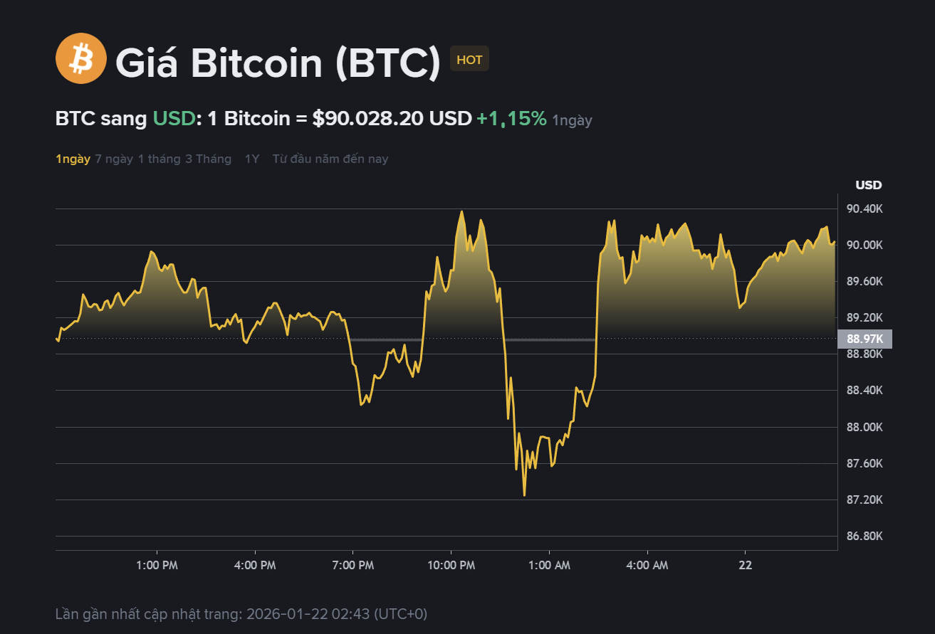 Tính đến sáng 22.1, Bitcoin được giao dịch quanh 90.028 USD, tăng 1,15% trong 24 giờ qua - Ảnh: Binance