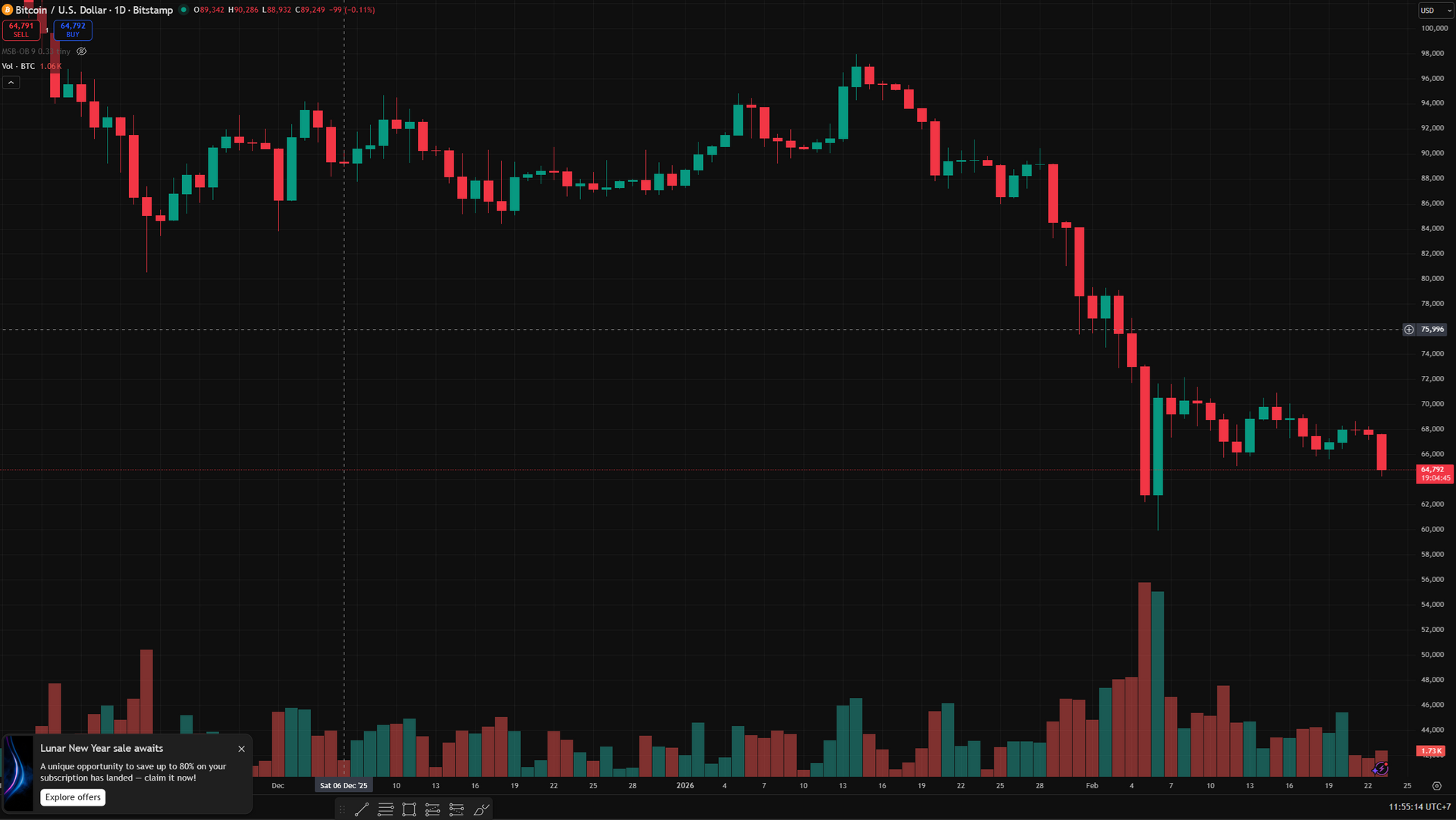 Trên biểu đồ ngày (D1), Bitcoin vẫn vận động trong xu hướng giảm trung hạn. Giá liên tục hình thành đỉnh sau thấp hơn đỉnh trước và đáy sau thấp hơn đáy trước. Đợt sụt mạnh đầu tháng 2 với khối lượng tăng cao đã củng cố vai trò chi phối của bên bán. Hiện BTC giao dịch quanh 64.000 - 65.000 USD, thấp hơn đáng kể so với vùng tích lũy trước đó.