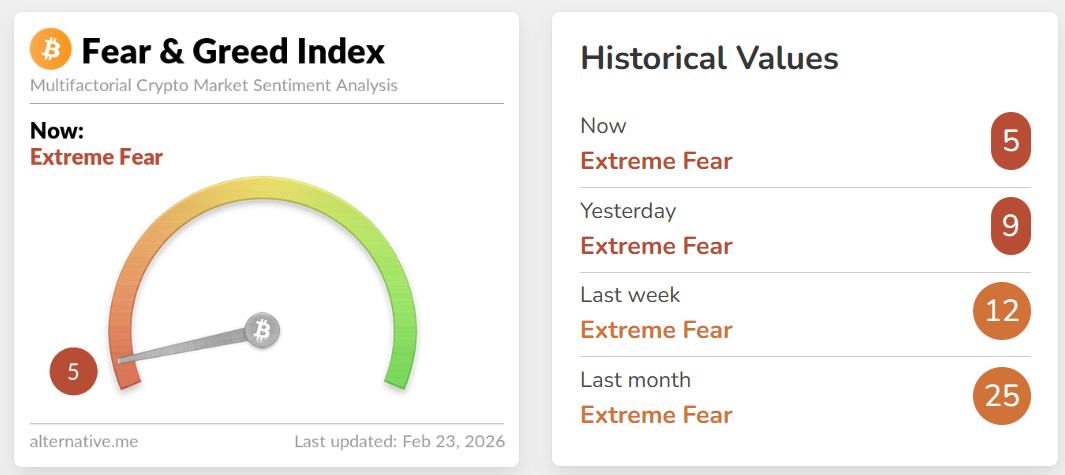 Chỉ số Sợ hãi & Tham lam (Fear & Greed Index) của thị trường tiền mã hóa ngày 23.2 giảm xuống mức 5 điểm, tiếp tục nằm trong vùng “sợ hãi tột độ” (Extreme Fear) và thấp hơn so với hôm qua (9 điểm). Đây là mức rất thấp, phản ánh tâm lý bi quan đang bao trùm thị trường tiền mã hóa.