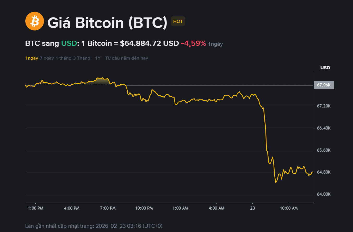 Tính đến trưa ngày 23.2, Bitcoin được giao dịch quanh 64.884 USD, giảm 4,59% trong 24 giờ qua - Ảnh: Binance
