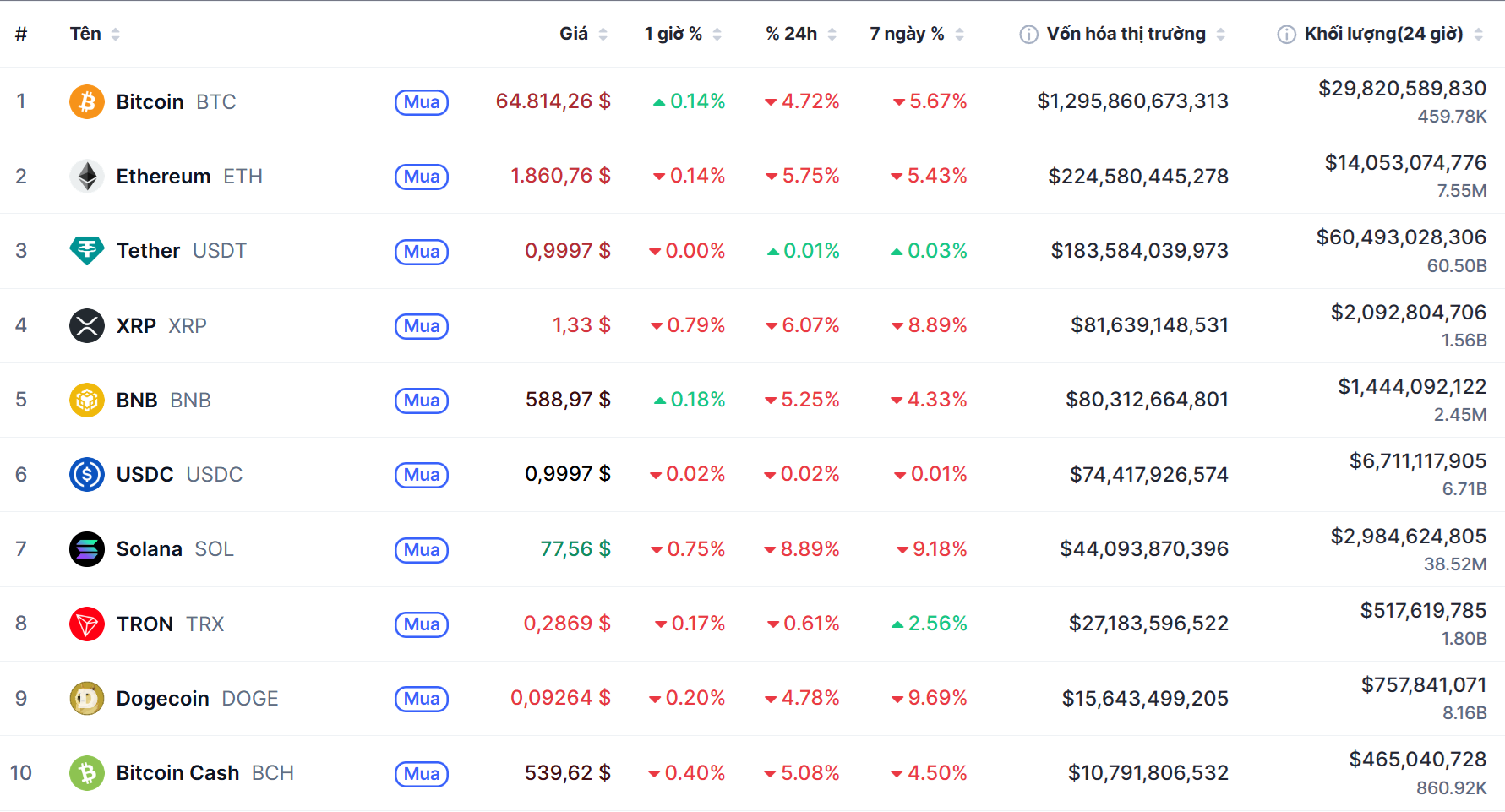 Biến động của Top 10 đồng coin lớn nhất thế giới