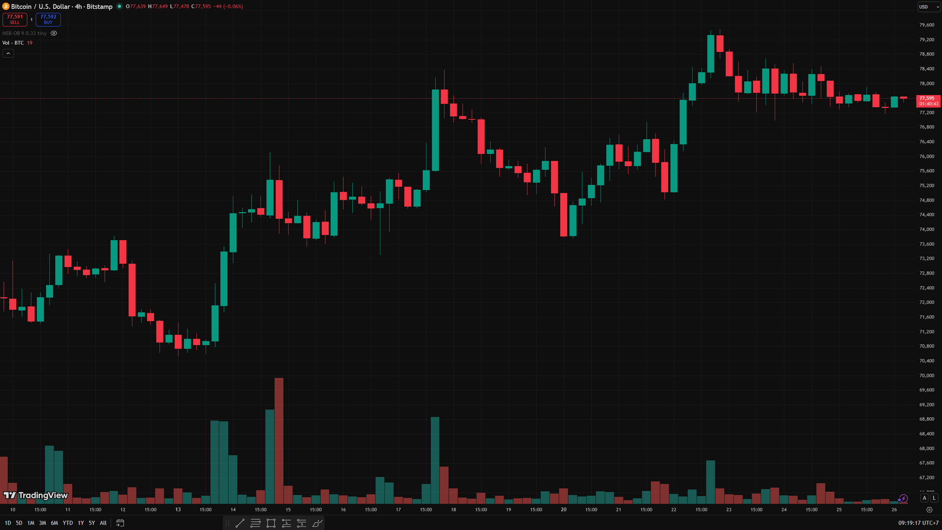 Ở khung 4 giờ (H4), xu hướng ngắn hạn thể hiện rõ trạng thái đi ngang sau nhịp tăng mạnh trước đó. Giá liên tục dao động trong biên độ hẹp quanh 77.000 USD, với các nến đan xen cho thấy sự giằng co. Các nhịp điều chỉnh diễn ra nhưng không phá vỡ cấu trúc tăng trước đó, cho thấy lực bán chưa đủ mạnh để đảo chiều. Tuy nhiên, việc chưa thể vượt dứt khoát vùng đỉnh gần cũng phản ánh động lực tăng đang suy yếu trong ngắn hạn.