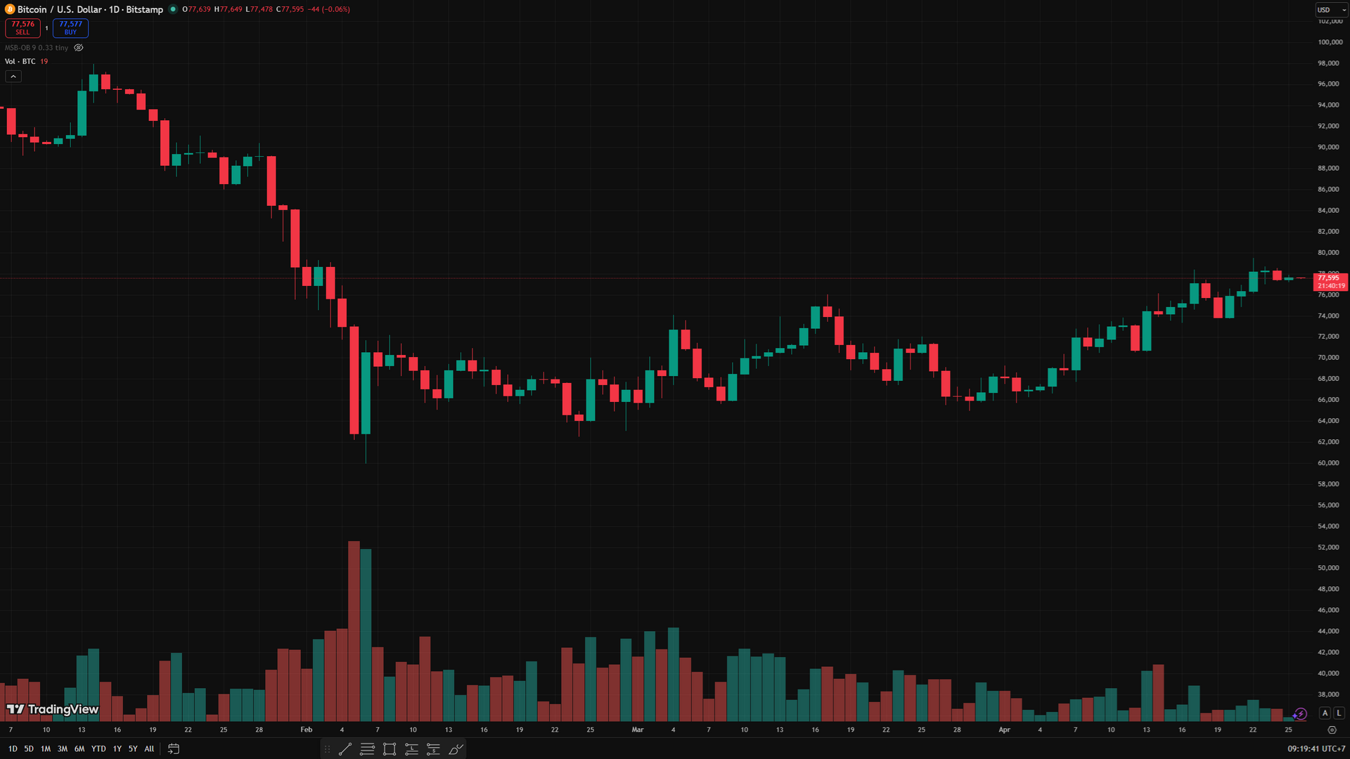 Biểu đồ giá theo ngày của BTC tính đến 26/4 - Ảnh: TradingView/Bitstamp.