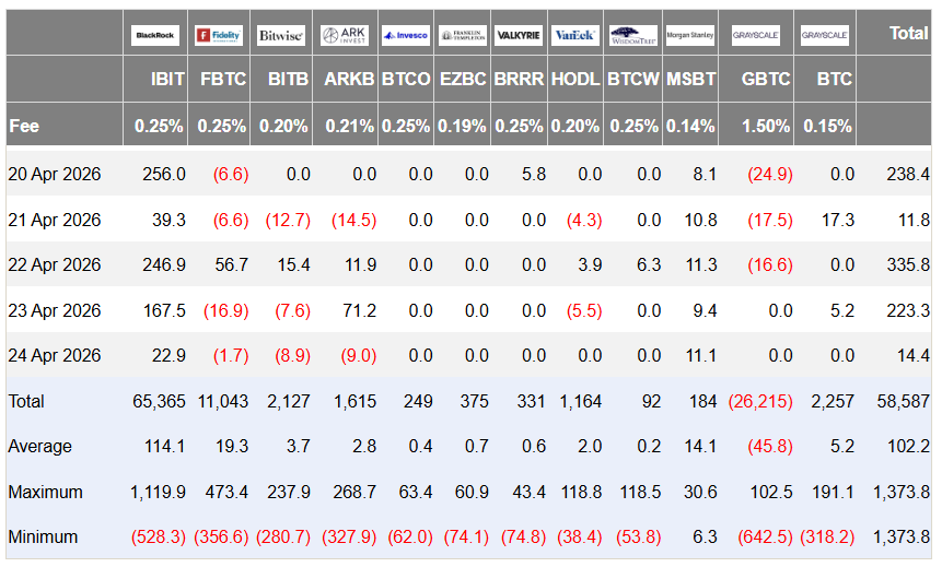 Dòng tiền ETF BTC từ ngày 20/4 - 24/4 (đơn vị triệu USD) - Ảnh: Farside Investors.