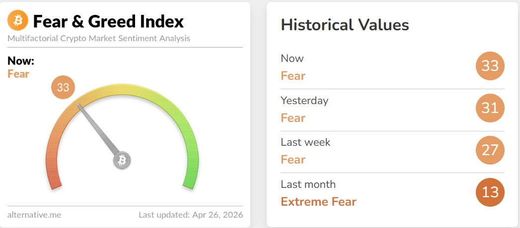 Chỉ số Sợ hãi và Tham lam của thị trường tiền mã hóa ngày 26/4 đạt mức 33 điểm, tiếp tục nằm trong vùng “sợ hãi” (Fear). So với mức 31 điểm của ngày trước đó, chỉ số đã nhích tăng nhẹ, cho thấy tâm lý nhà đầu tư có dấu hiệu cải thiện nhưng vẫn còn thận trọng. Điều này phản ánh thị trường chưa thực sự thoát khỏi trạng thái dè chừng trong ngắn hạn.