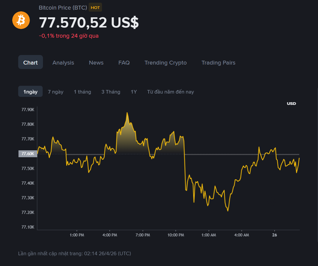 Tính đến sáng 26/4, Bitcoin được giao dịch quanh 77.570 USD, giảm 0,1% trong 24 giờ qua - Ảnh: Binance.