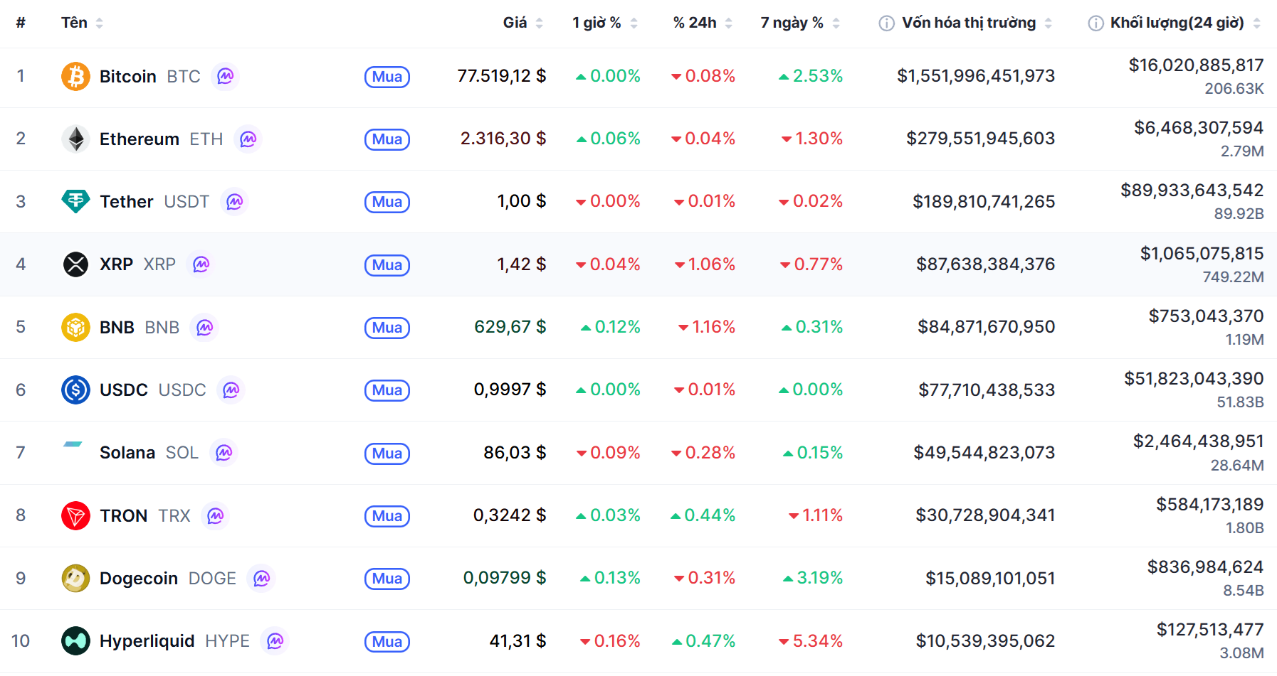 Giá Bitcoin hiện đang giao dịch quanh mức 77.570 USD, với vốn hóa thị trường vào khoảng 1.553 tỉ USD và khối lượng giao dịch trong 24 giờ đạt gần 20 tỉ USD.
