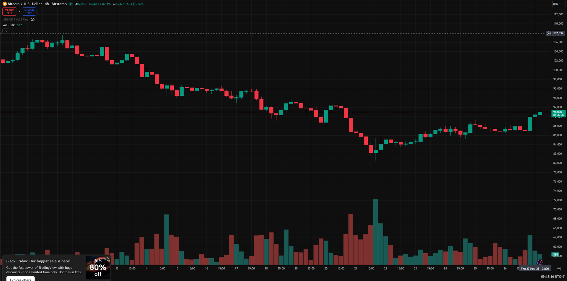 Trên khung 4 giờ, diễn biến chi tiết hơn cho thấy giai đoạn giằng co rõ rệt nhưng vẫn nằm trong cấu trúc giảm. Sau cú rơi mạnh về vùng 81.000 USD vào ngày 21 - 22.11, BTC bắt đầu tạo một nhịp hồi phục tương đối ổn định, kéo giá quay lại quanh 91.000 USD. Các cây nến xanh xuất hiện liên tiếp trong ba ngày gần đây cho thấy lực bán đã suy yếu đáng kể, đồng thời phản ánh quá trình thị trường cố gắng thiết lập mặt bằng giá mới.