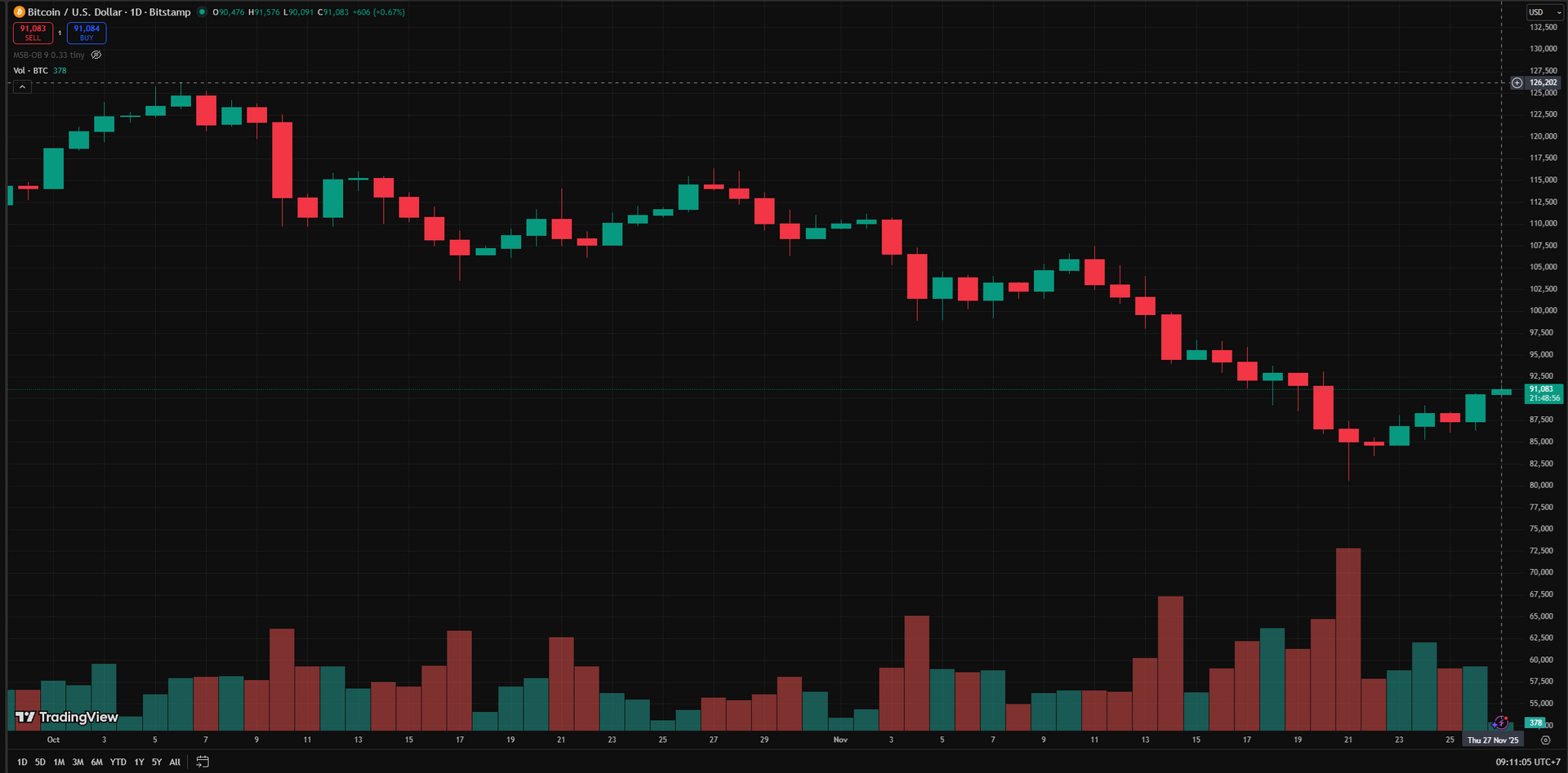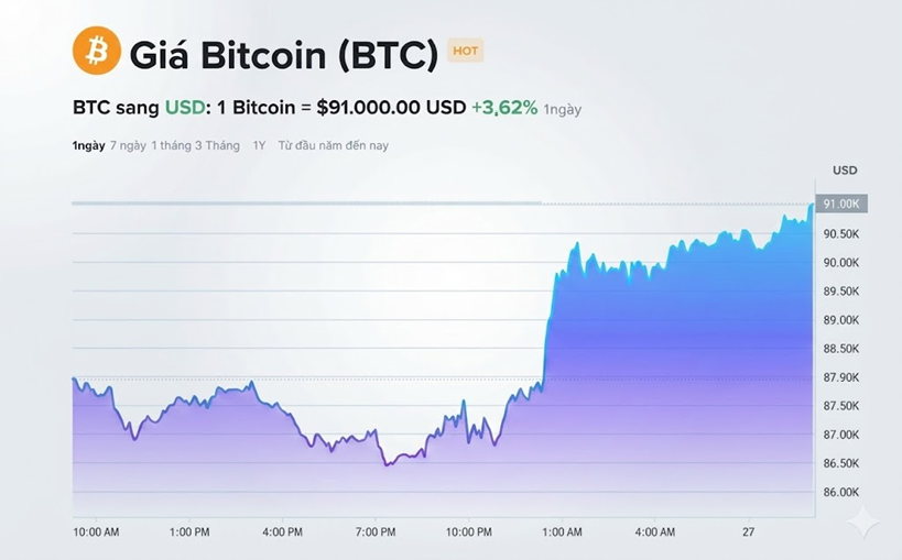 Giá Bitcoin hiện giao dịch quanh 91.000 USD, tương ứng vốn hóa khoảng 1.815 tỉ USD, khối lượng giao dịch 24 giờ đạt hơn 66 tỉ USD. Trong phiên ngày 26.11, đồng tiền số ghi nhận biến động mạnh, dao động trong vùng 86.300 - 90.600 USD.