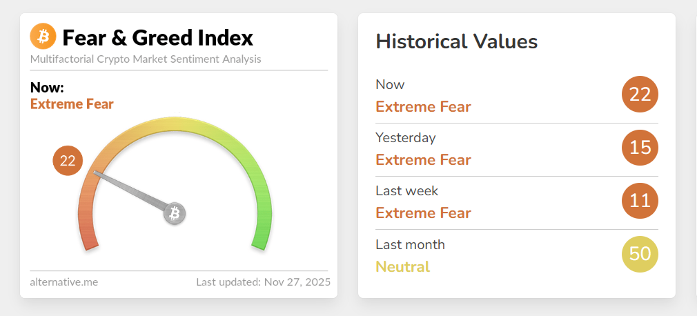 Chỉ số Sợ hãi & Tham lam (Fear & Greed Index) của thị trường tiền mã hóa ngày 27.11 ghi nhận 22 điểm, tiếp tục phản ánh trạng thái “sợ hãi tột độ”. Mức tăng nhẹ so với 15 điểm của ngày hôm qua cho thấy tâm lý thị trường có phần ổn định hơn, nhưng vẫn bi quan.