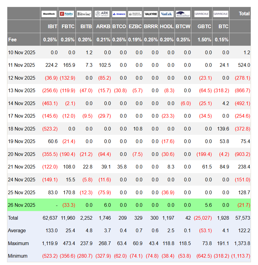 Dòng tiền ETF BTC từ ngày 10.11 - 26.11 (đơn vị triệu USD) - Ảnh: Farside Investors