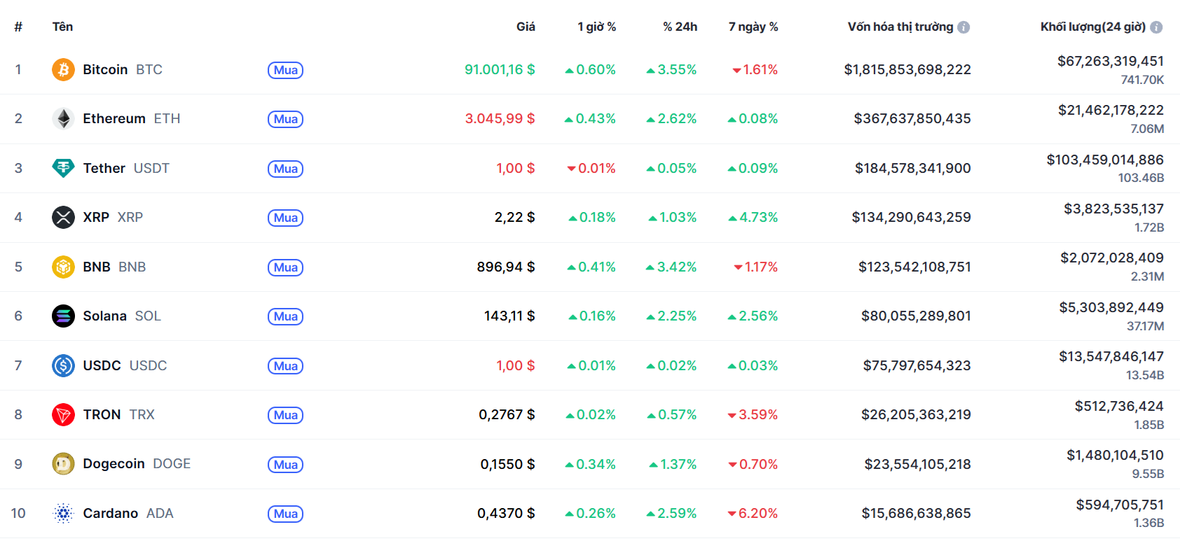 Biến động của Top 10 đồng coin lớn nhất thế giới