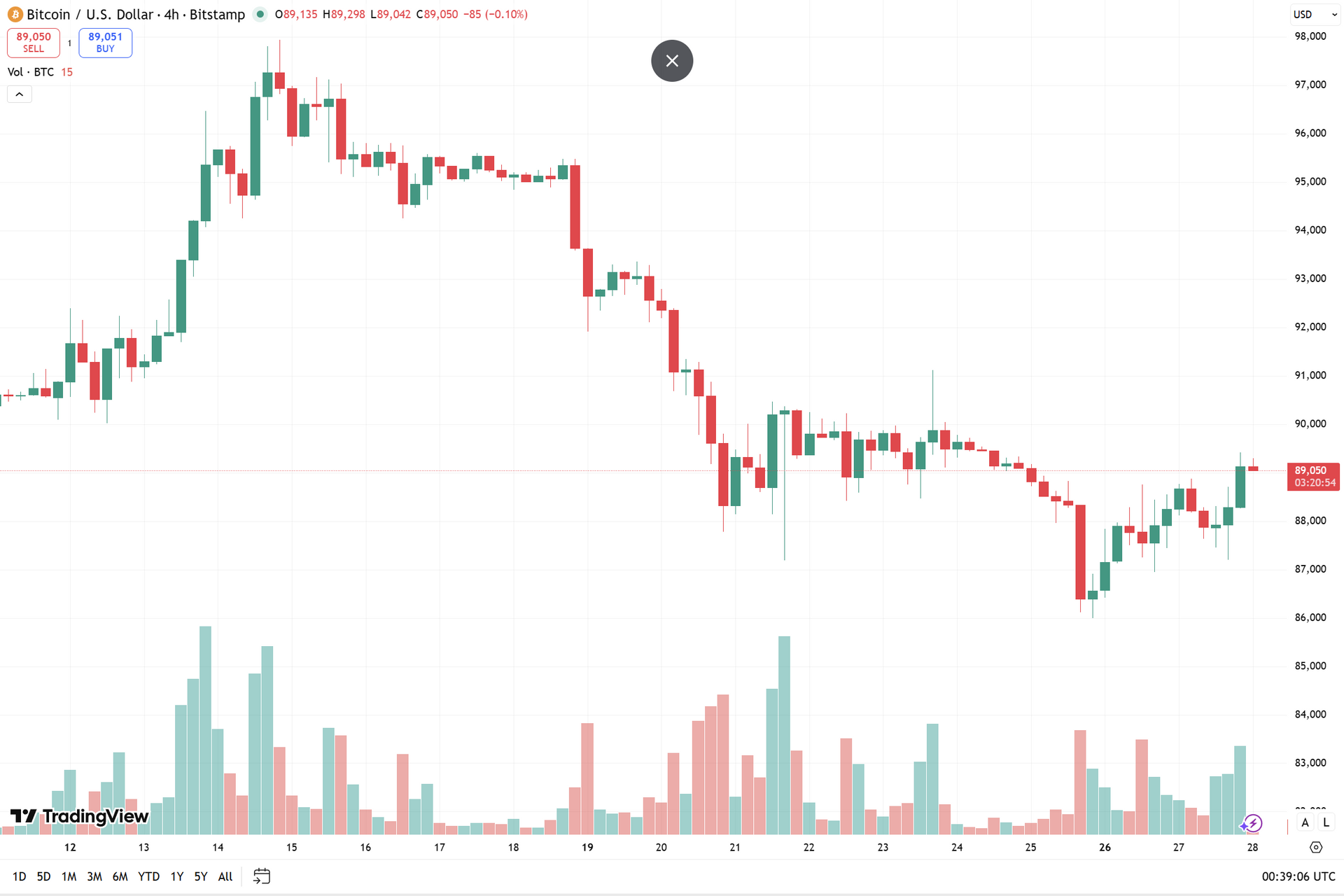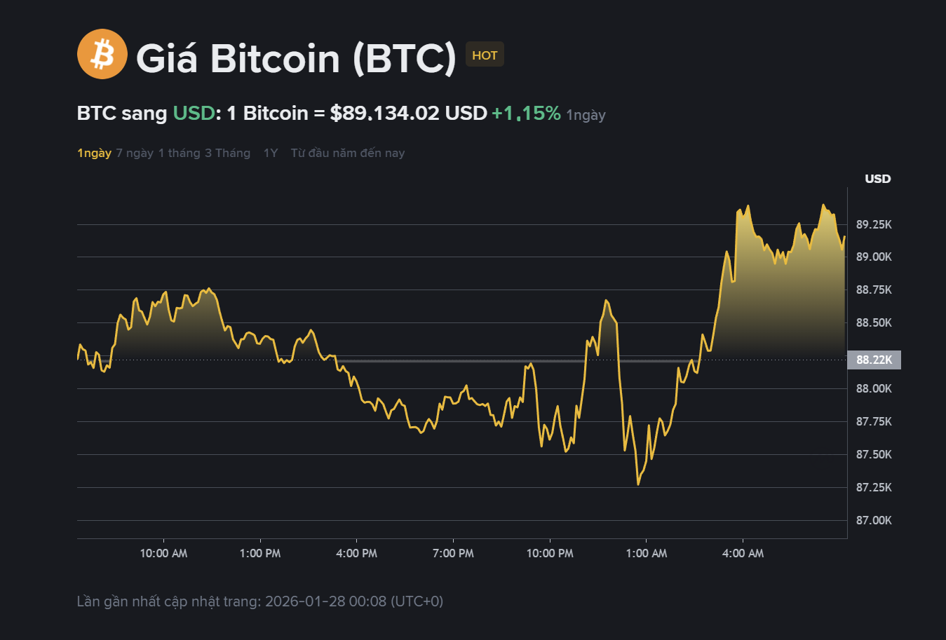 Tính đến sáng 28.1, Bitcoin được giao dịch quanh 89.134 USD, tăng 1,15% trong 24 giờ qua - Ảnh: Binance