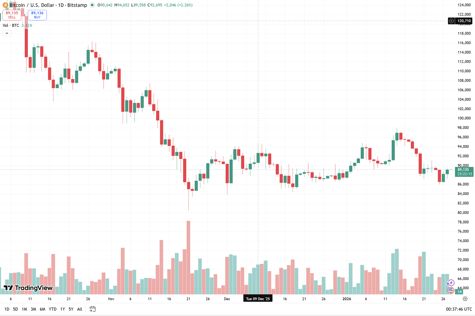Biểu đồ giá theo ngày của BTC tính đến 28.1 - Ảnh: TradingView/Bitstamp