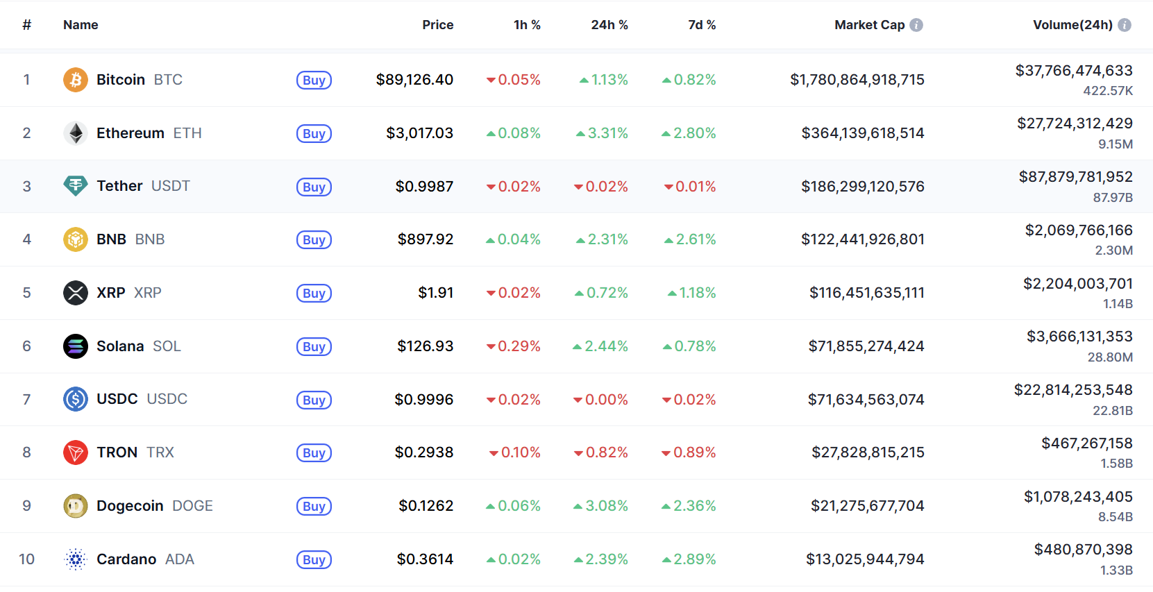 Giá Bitcoin hiện đang giao dịch quanh mức 89.134 USD, với vốn hóa thị trường vào khoảng 1.781 tỉ USD và khối lượng giao dịch trong 24 giờ đạt gần 40 tỉ USD.