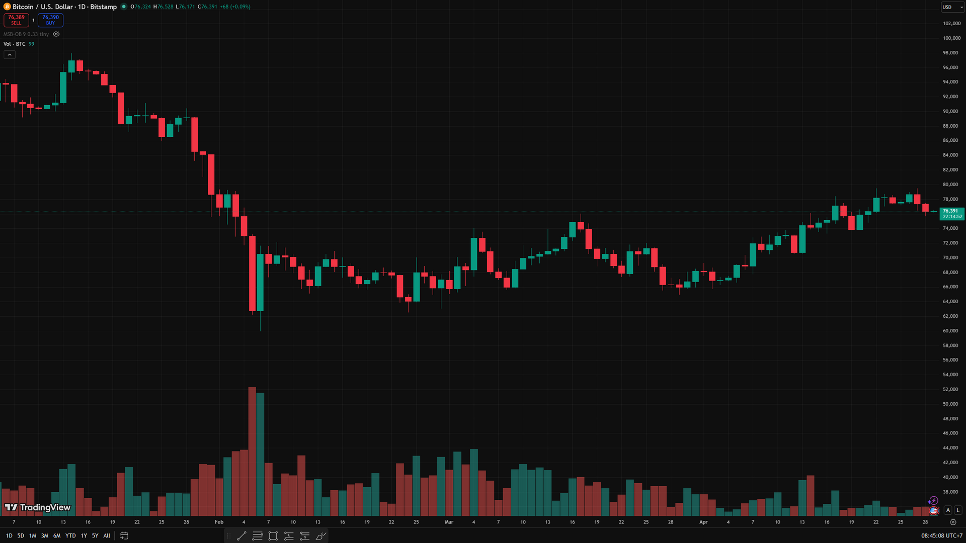 Biểu đồ giá theo ngày của BTC tính đến 29/4 - Ảnh: TradingView/Bitstamp.