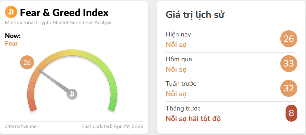 Chỉ số Sợ hãi & Tham lam ngày 29/4 giảm xuống mức 26 điểm, nằm trong vùng “sợ hãi” (Fear), cho thấy tâm lý thị trường đang trở nên bi quan hơn so với những ngày trước. So với mức 33 điểm của hôm qua, đà suy giảm này phản ánh áp lực bán gia tăng và sự thận trọng rõ rệt của nhà đầu tư.