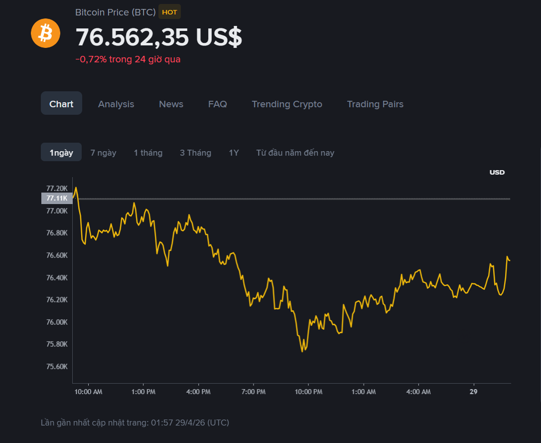 Tính đến sáng 29/4, Bitcoin được giao dịch quanh 76.562 USD, giảm 0,72% trong 24 giờ qua - Ảnh: Binance.
