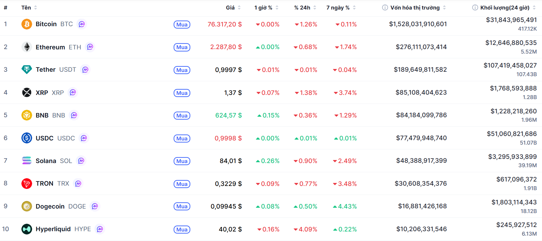 Giá Bitcoin hiện đang giao dịch quanh mức 76.562 USD, với vốn hóa thị trường vào khoảng 1.532 tỉ USD và khối lượng giao dịch trong 24 giờ đạt hơn 30 tỉ USD.