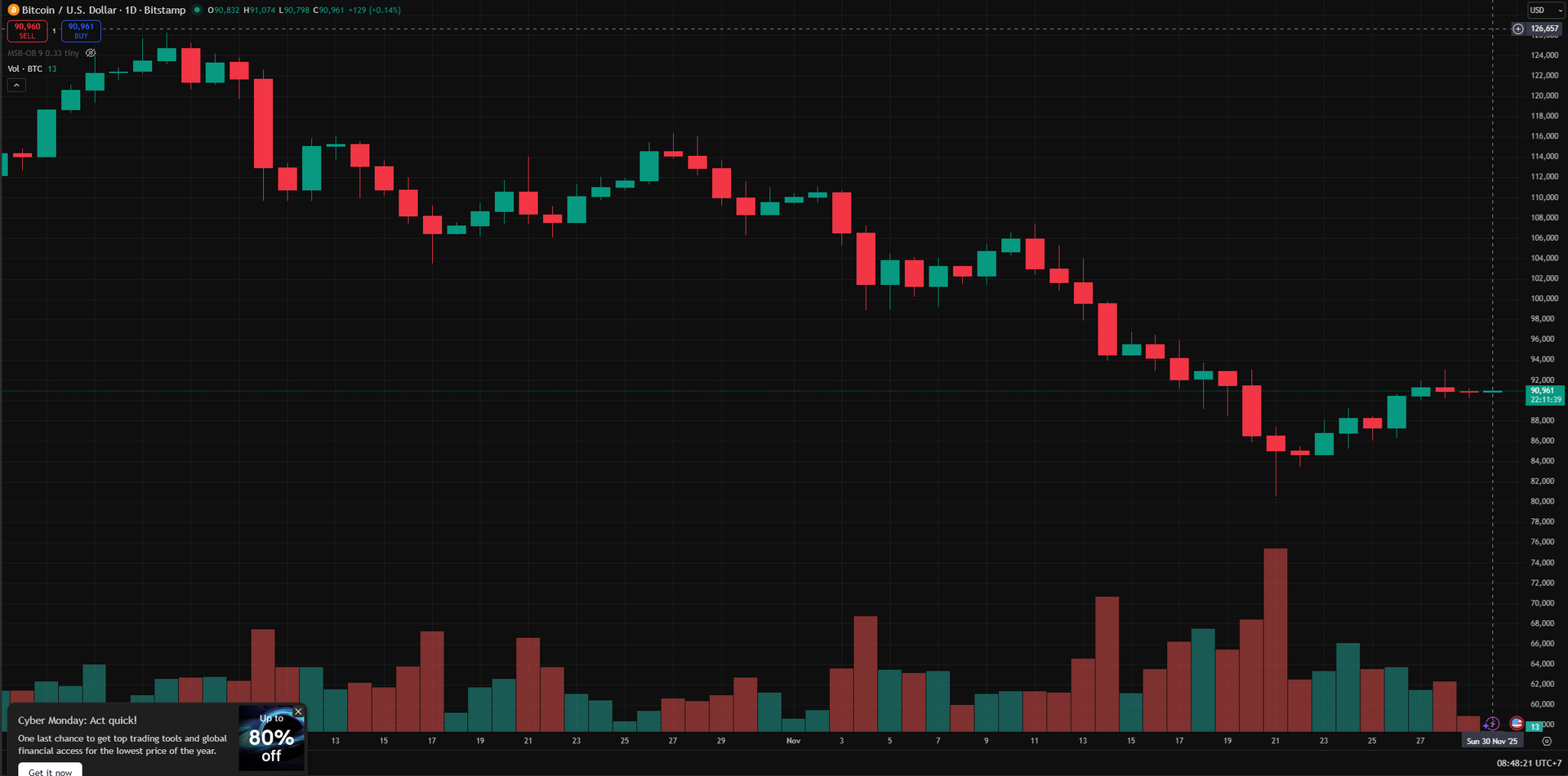 Trên khung ngày, Bitcoin tiếp tục thể hiện xu hướng giảm kéo dài từ đỉnh 126.000 USD, nhưng tốc độ giảm đã chậm lại rõ rệt trong giai đoạn cuối tháng 11. Sau nhịp rơi mạnh về vùng 81.000 USD - mức thấp nhất trong hơn 6 tuần - lực bán bắt đầu suy yếu, thể hiện qua những cây nến xanh nhỏ xuất hiện liên tiếp. Điều này cho thấy phe bán đã không còn giữ ưu thế tuyệt đối.