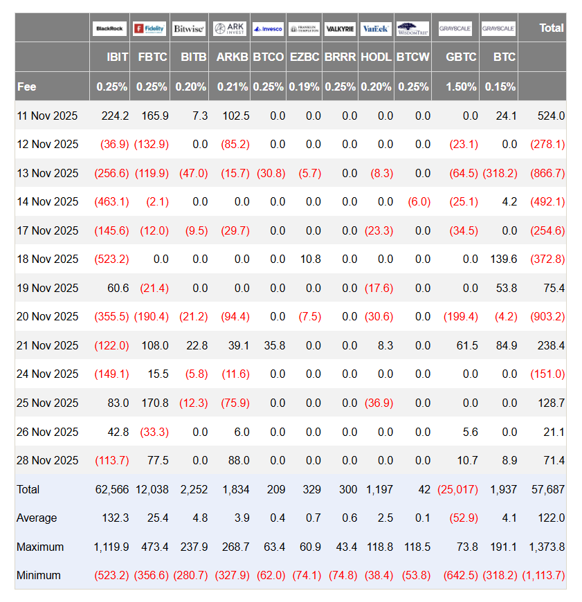 Dòng tiền ETF BTC từ ngày 11.11 - 28.11 (đơn vị triệu USD) - Ảnh: Farside Investors
