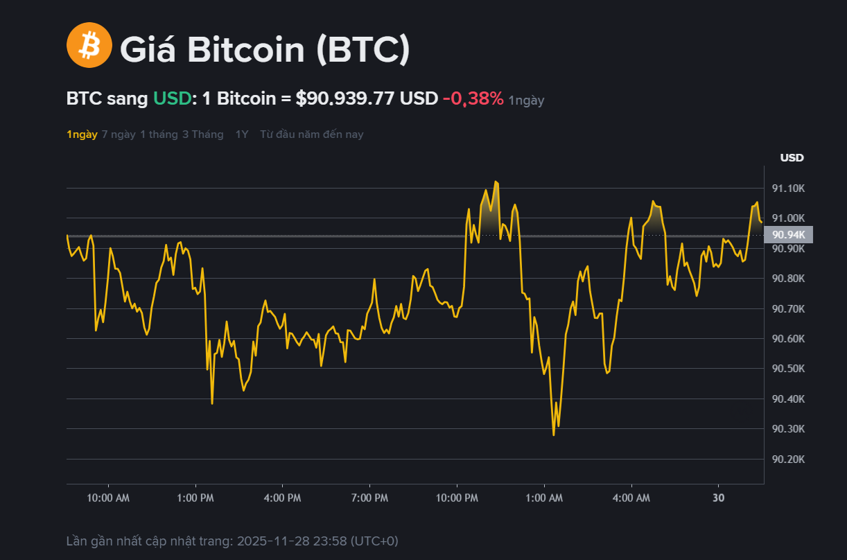 Giá Bitcoin hiện đang giao dịch quanh mức 90.939 USD, với vốn hóa thị trường vào khoảng 1,814 tỉ USD và khối lượng giao dịch trong 24 giờ đạt hơn 60 tỉ USD. Trong phiên ngày 29.11, đồng tiền số này duy trì trạng thái dao động hẹp, biến động trong vùng 90.100 - 91.100 USD.