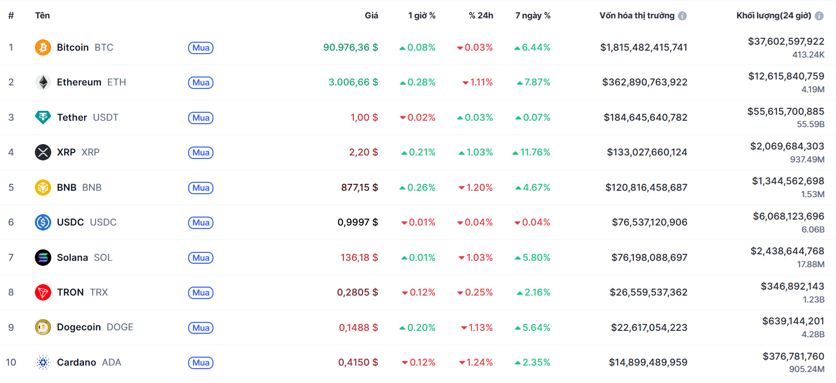 Ethereum (ETH) tăng 1,11% lên 3.006 USD. XRP cũng duy trì sự tích cực với mức tăng 1,03%, đạt 2,20 USD. Ngược lại, BNB giảm nhẹ 1,20% xuống còn 877,15 USD, dù mức điều chỉnh không lớn nhưng cho thấy dòng tiền vào BNB đang chậm lại.
