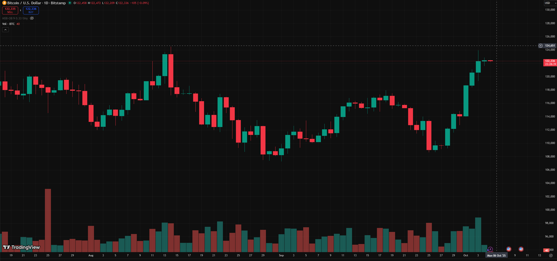 Biểu đồ ngày cho thấy Bitcoin (BTC) đã tăng gần 12,6% chỉ trong vài ngày, từ mức 110.000 USD lên sát 124.000 USD, nhờ lực mua mạnh và tâm lý lạc quan của nhà đầu tư.