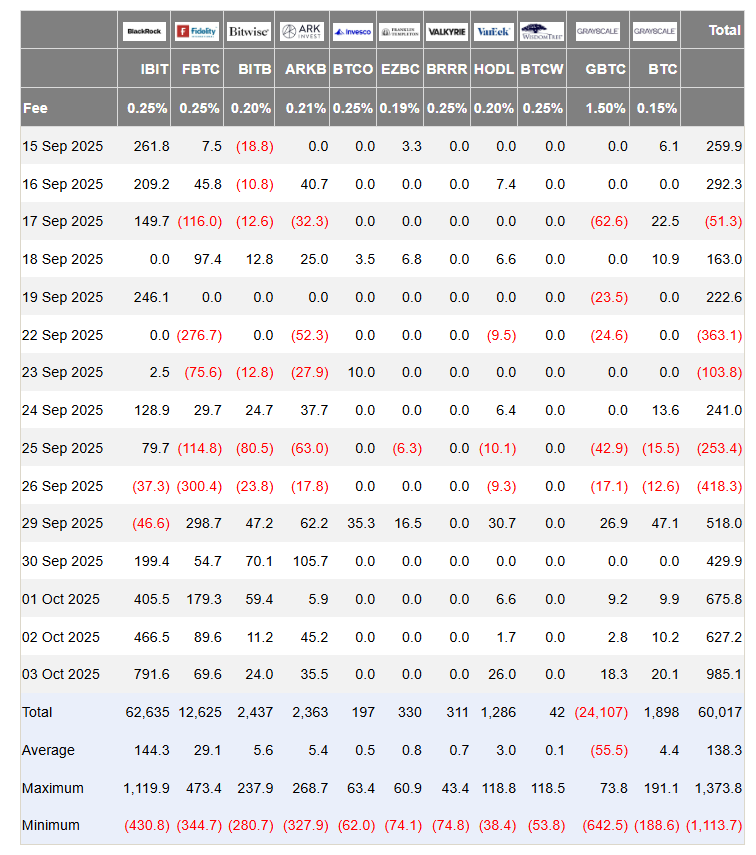 Dòng tiền ETF BTC từ ngày 15.9 đến 3.10 (đơn vị triệu USD) - Ảnh: Farside Investors