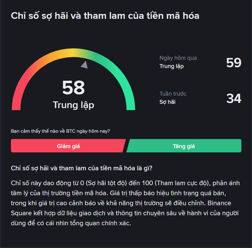 Dựa trên dữ liệu từ Binance, chỉ số “sợ hãi” và “tham lam” (Fear & Greed Index) cho thị trường tiền mã hóa (chủ yếu dựa trên Bitcoin và các đồng coin lớn) hiện ở mức 58 được phân loại là trung lập (Neutral).