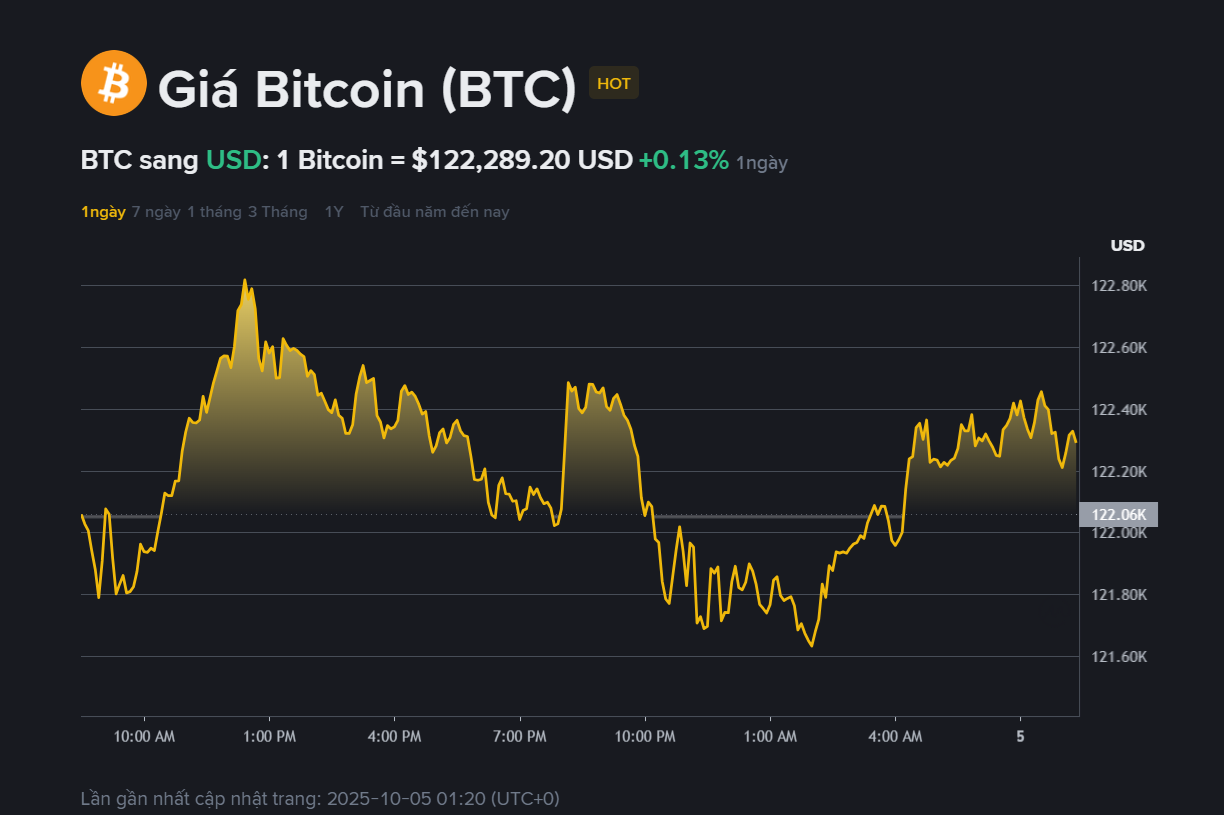 Tính đến sáng 5.10, Bitcoin được giao dịch quanh 122.289 USD, tăng 0,13% trong 24 giờ qua - Ảnh: Binance