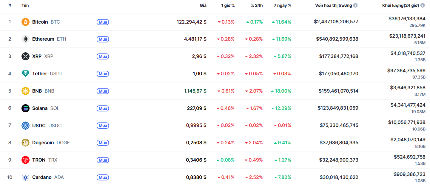 Biến động của Top 10 đồng coin lớn nhất thế giới