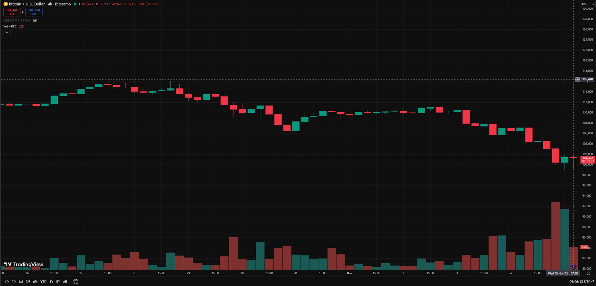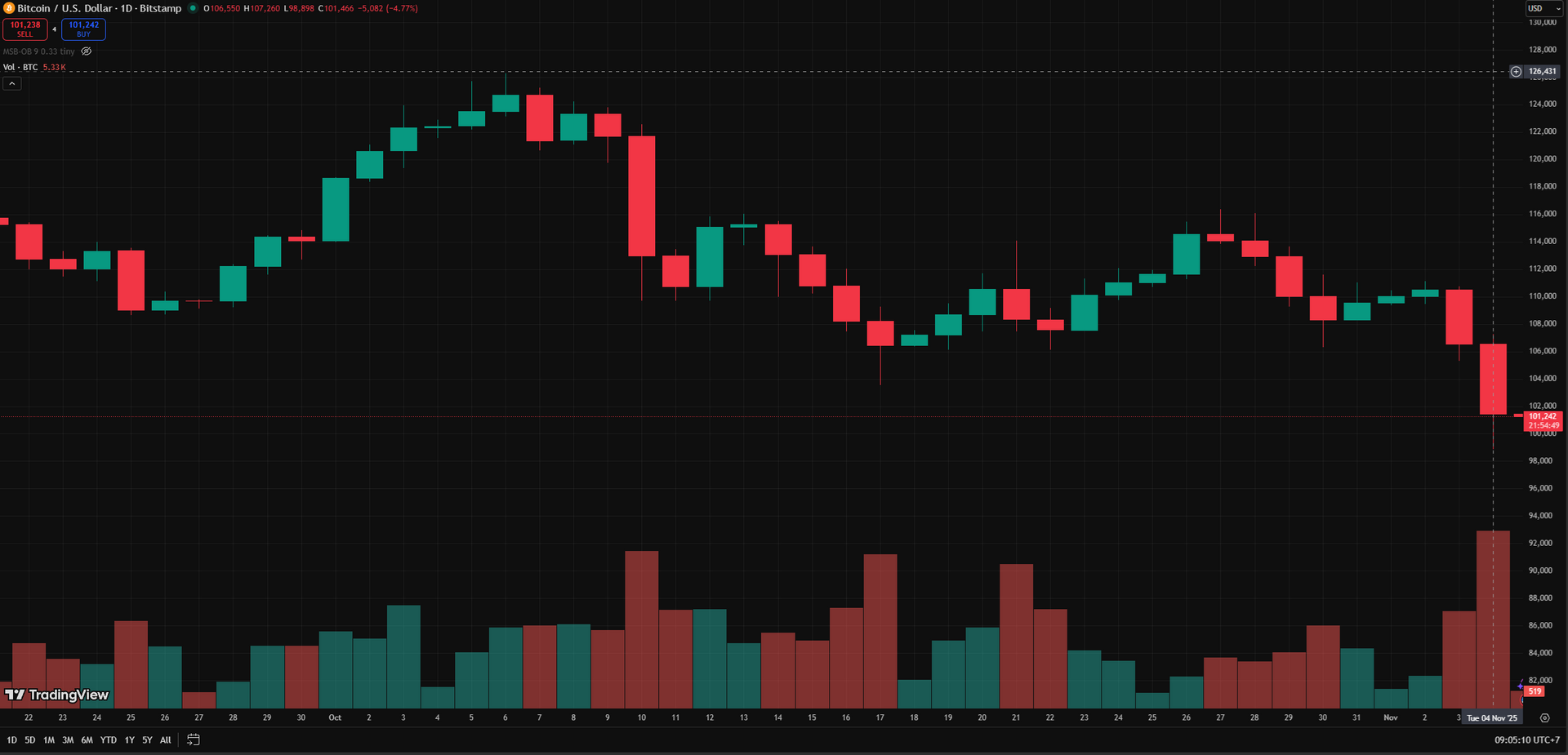 Quan sát trên khung ngày, giá Bitcoin hiện giao dịch quanh 101.300 USD, giảm gần 5% chỉ trong một ngày. Chuỗi nến đỏ liên tiếp với thân dài cho thấy lực bán đang áp đảo hoàn toàn. Đặc biệt, khối lượng giao dịch tăng vọt ở cây nến giảm cuối cùng là tín hiệu rõ ràng của hiện tượng bán tháo (panic selling).