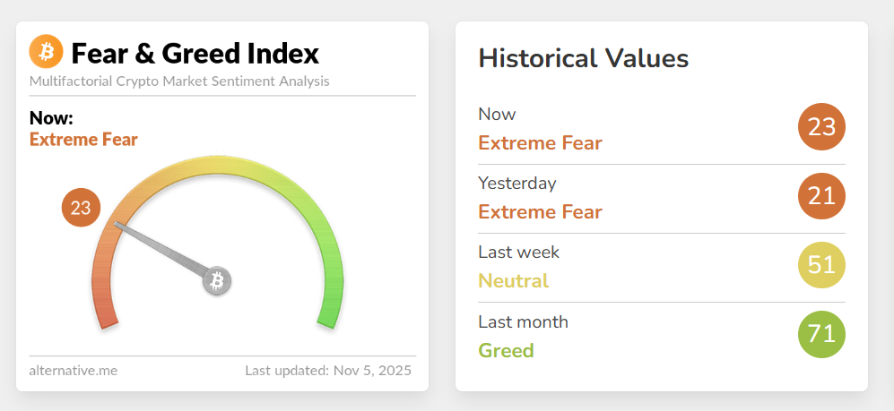 Chỉ số Sợ hãi & Tham lam (Fear & Greed Index) của thị trường tiền mã hóa ngày 5.11 giảm sâu xuống mức 23 điểm, cho thấy tâm lý “sợ hãi tột độ” (Extreme Fear) vẫn bao trùm sau đợt điều chỉnh mạnh của Bitcoin.