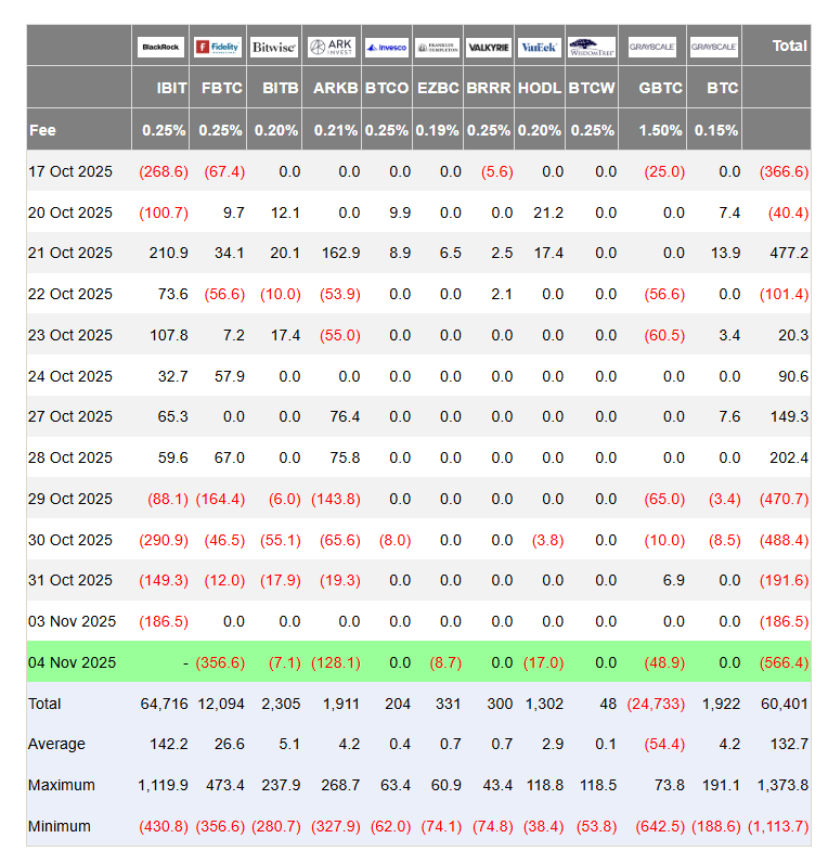 Dòng tiền ETF BTC từ ngày 17.10 - 4.11 (đơn vị triệu USD) - Ảnh: Farside Investors