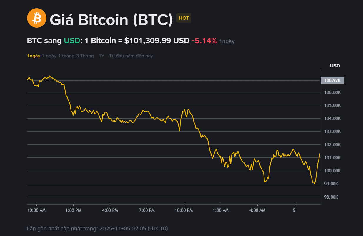 Tính đến sáng 5.11, Bitcoin được giao dịch quanh 101.300 USD, giảm 5,1% trong 24 giờ qua - Ảnh: Binance
