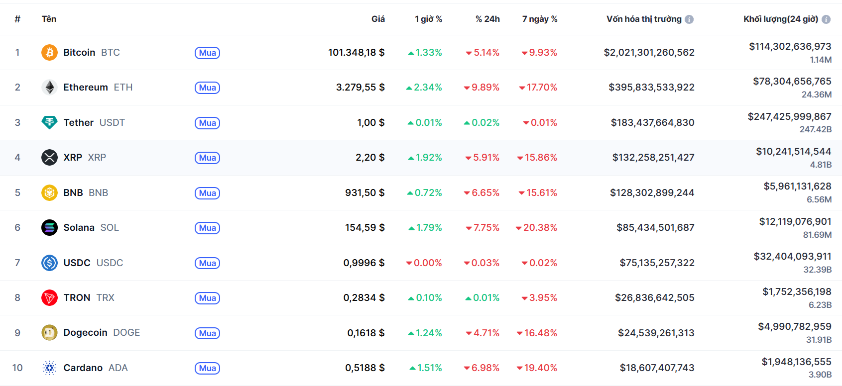 Biến động của Top 10 đồng coin lớn nhất thế giới