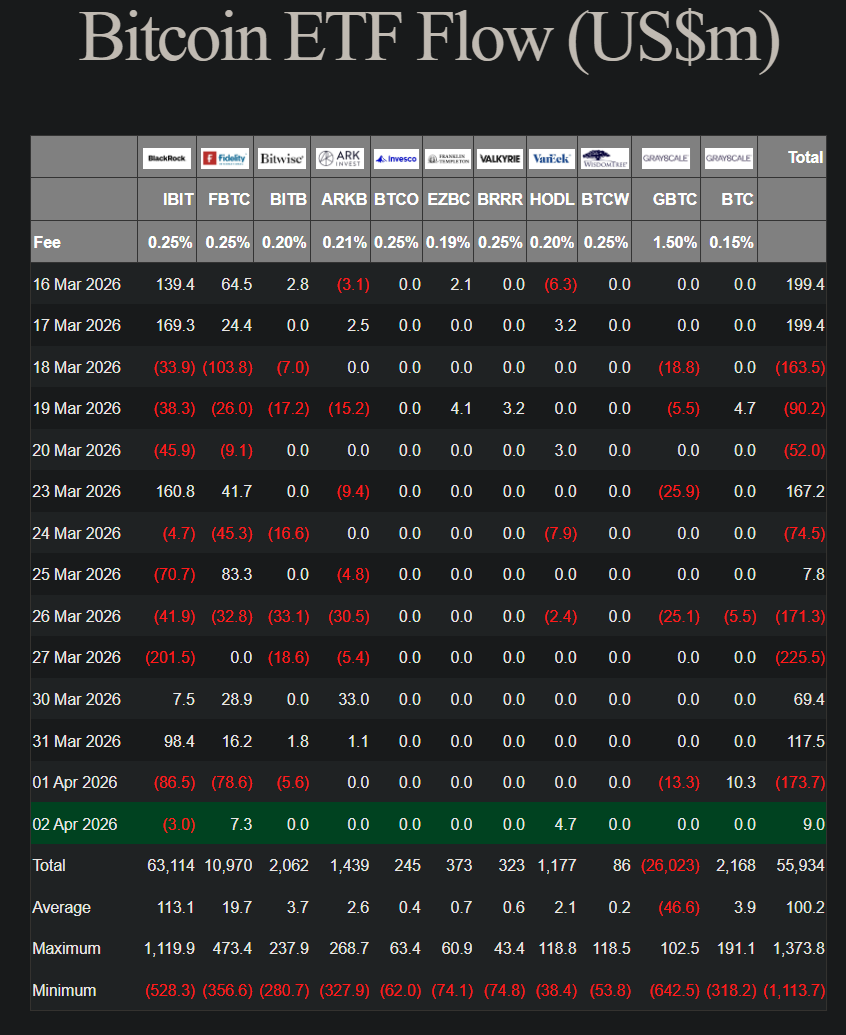 Tuy nhiên, đà phục hồi không kéo dài. Sang ngày 1.4, thị trường đảo chiều mạnh với 173,7 triệu USD rút ròng. Áp lực bán lan rộng trên nhiều quỹ lớn, trong đó IBIT (86,5 triệu USD) và FBTC (78,6 triệu USD) là hai yếu tố chính kéo giảm tổng dòng vốn. BITB (Bitwise) và GBTC (Grayscale) cũng ghi nhận dòng tiền âm, cho thấy xu hướng rút vốn mang tính hệ thống thay vì chỉ diễn ra cục bộ. Đến ngày 2.4, thị trường có dấu hiệu ổn định trở lại với 9 triệu USD vào ròng nhẹ. Dòng tiền vẫn phân hóa khi IBIT tiếp tục bị rút ròng nhẹ (3 triệu USD), trong khi FBTC và một số quỹ nhỏ ghi nhận dòng vốn vào. Mức tăng khiêm tốn cho thấy lực mua đã quay lại nhưng chưa đủ mạnh để tạo xu hướng rõ ràng.
